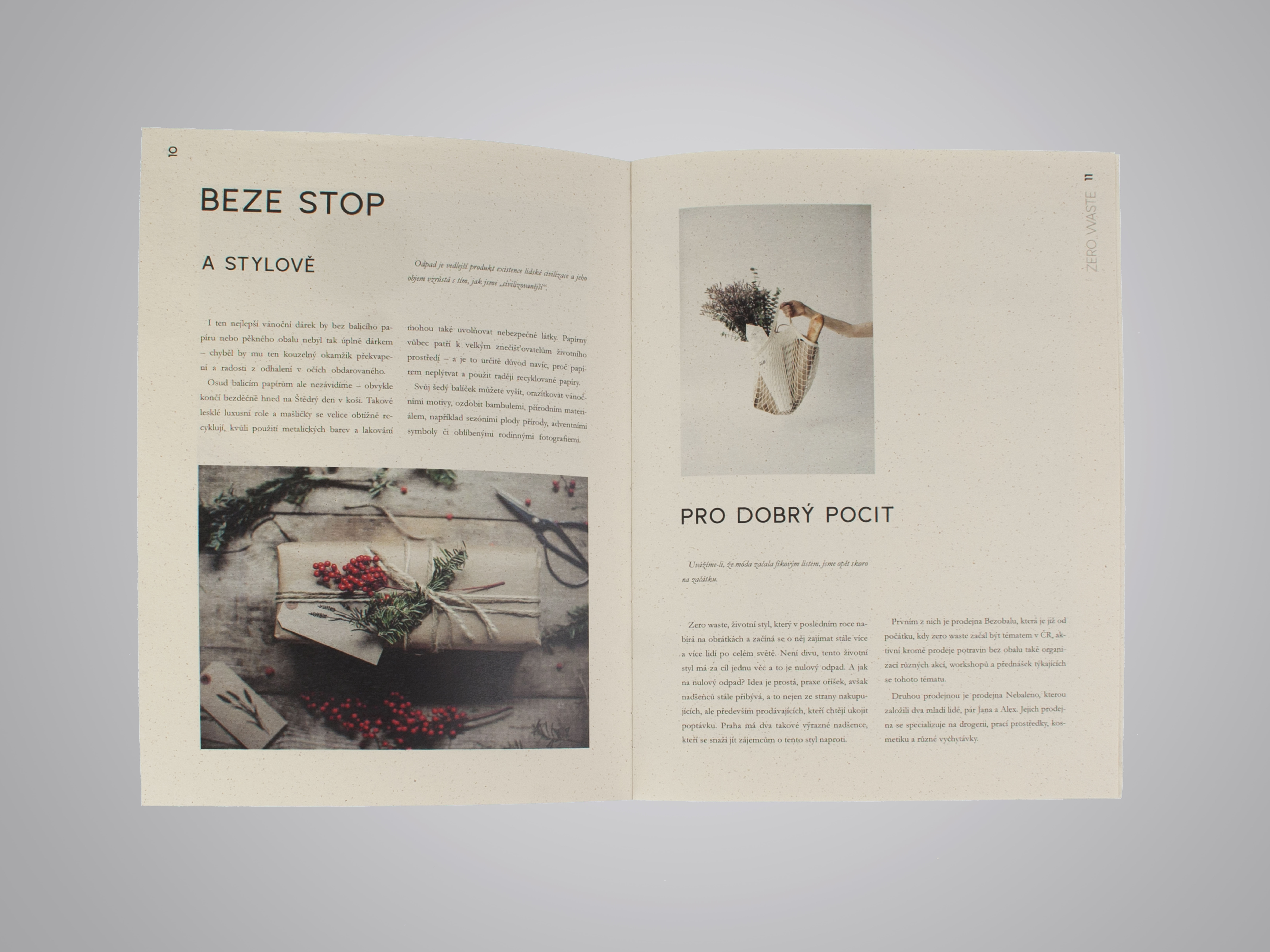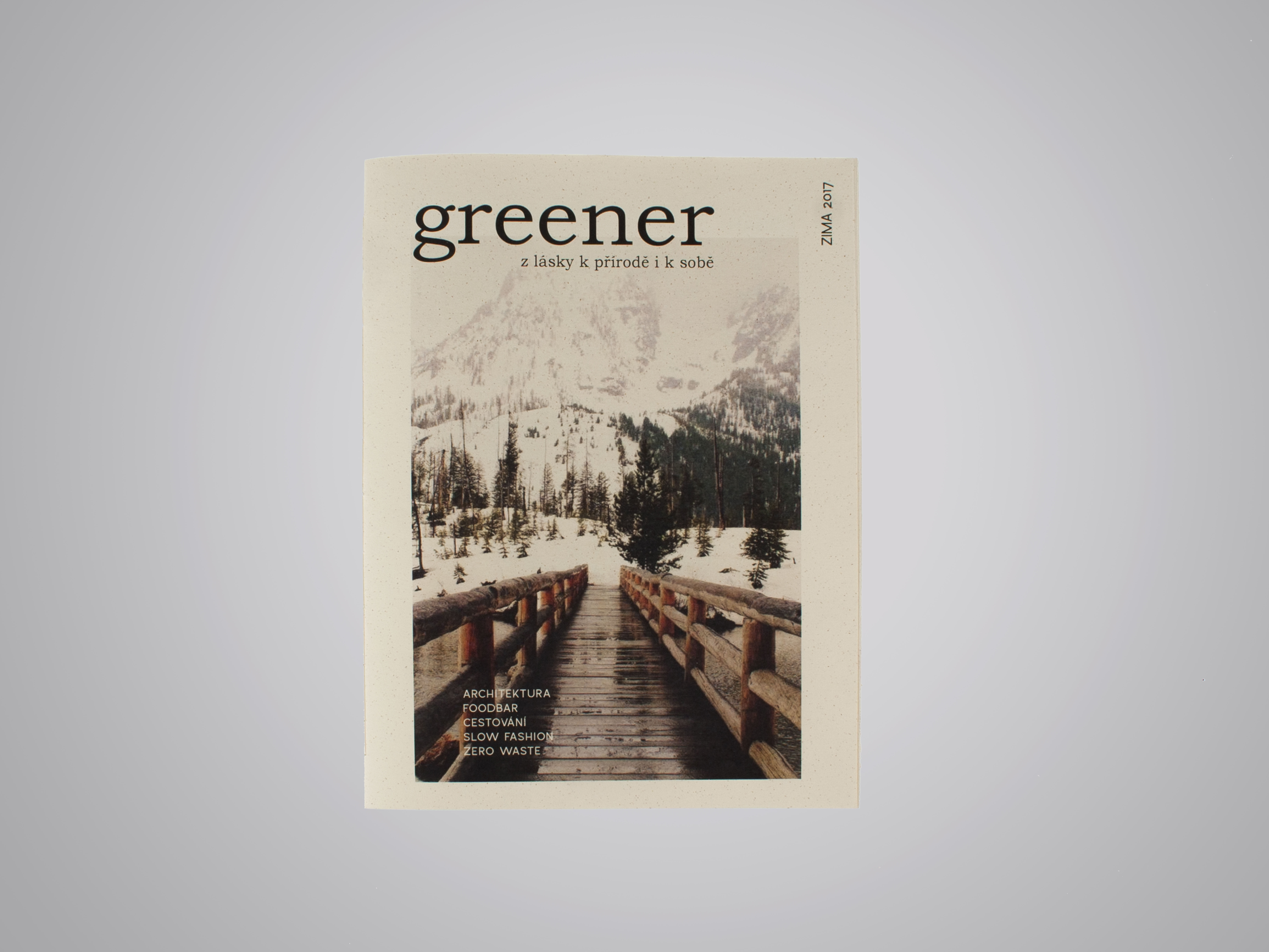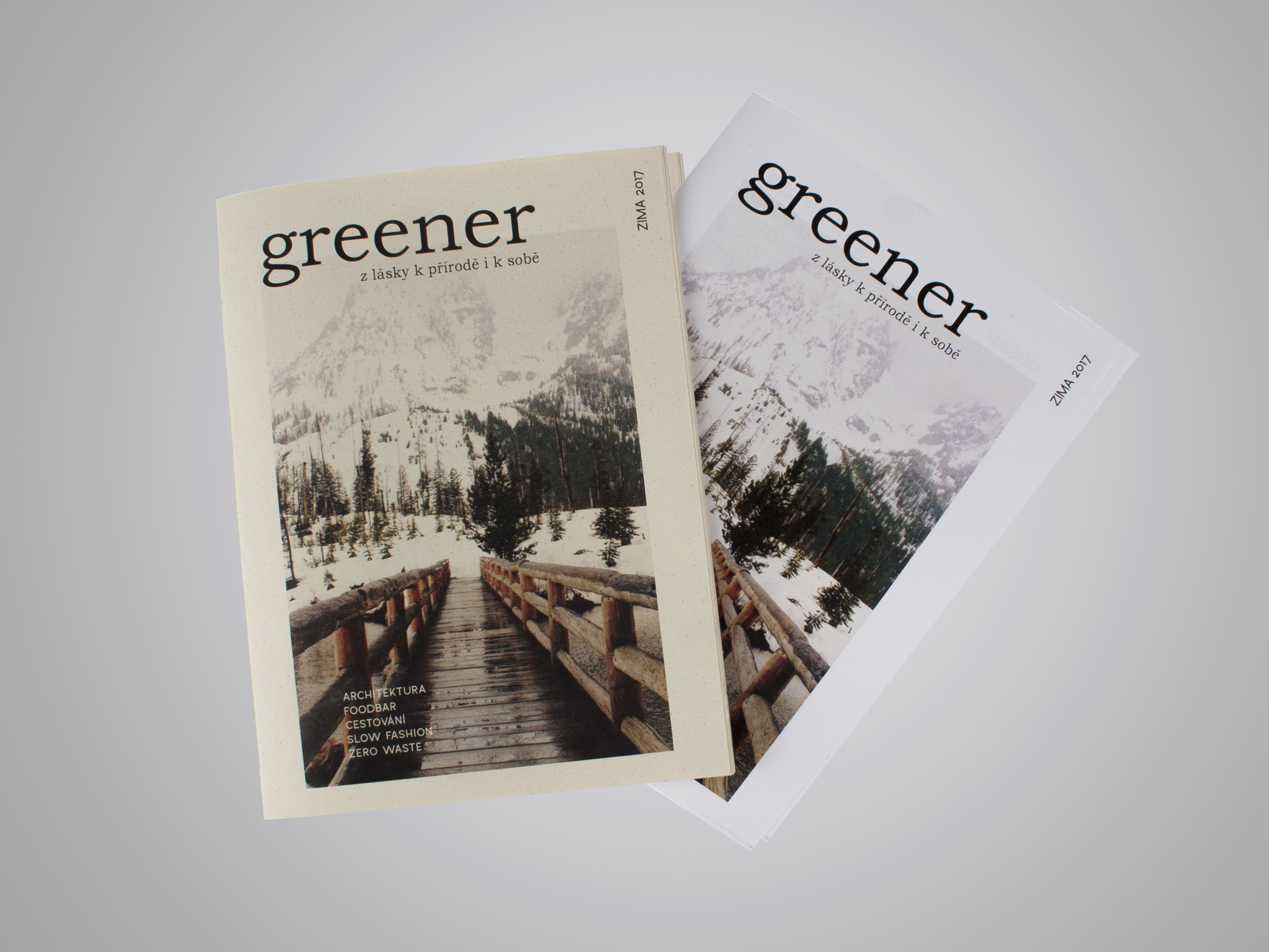 GREENER je název mého lifestylového čtvrtletního časopisu o zdravém jídle, inovativních a ekologických stavbách, slow fashion, cestování a ekologickém způsobu života. Tématicky je zvolen i papír pro časopis s využitím pivního odpadu. Tištěná i digitální podoba, rozměr A4.