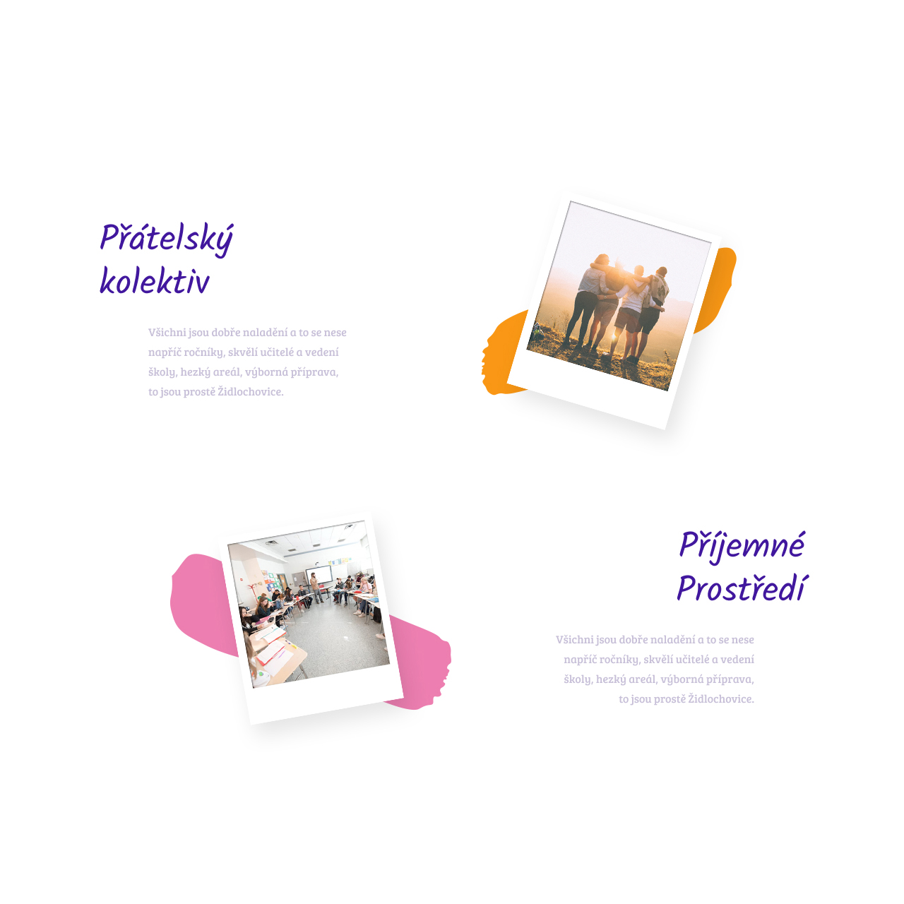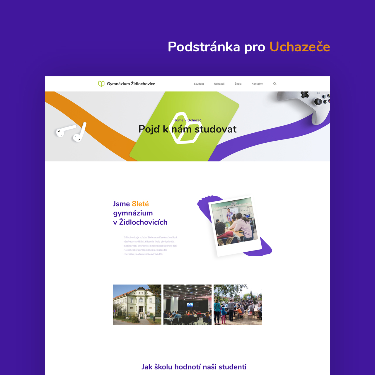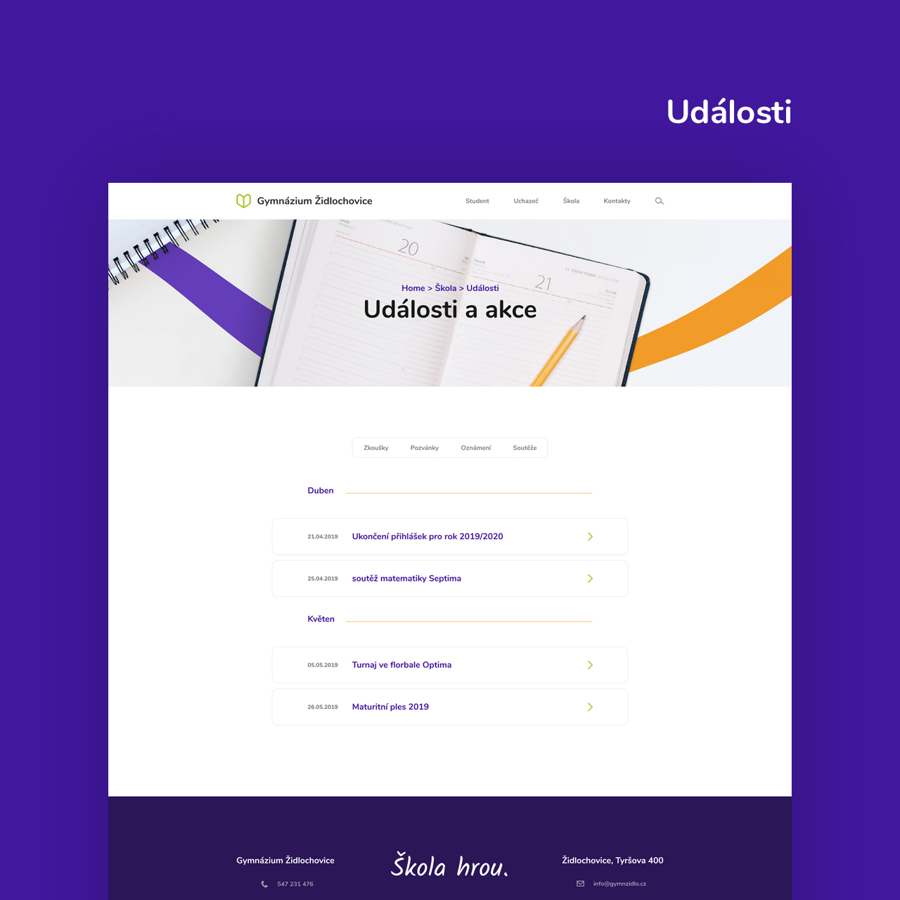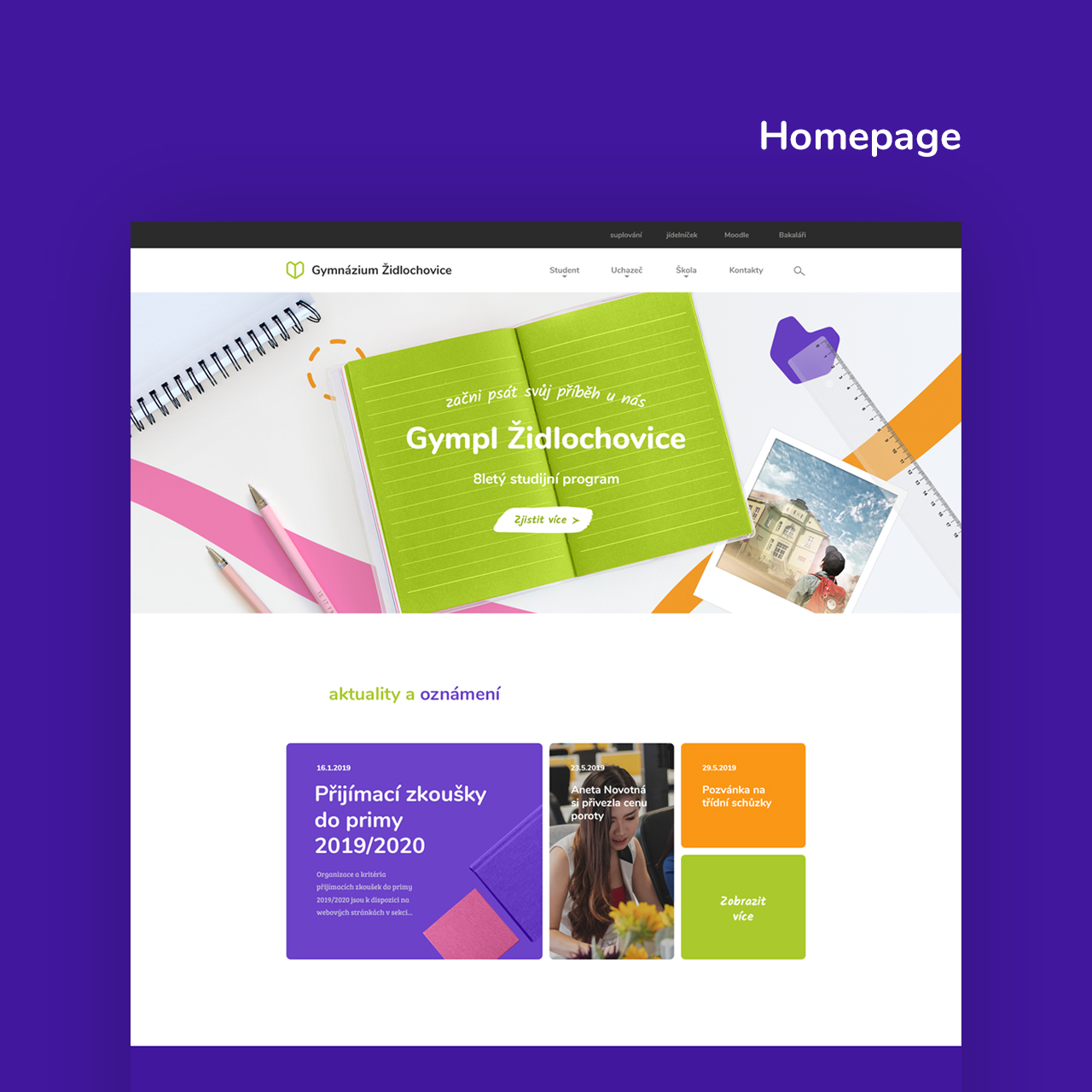 Cílem bylo vytvořit novou webovou prezentaci společně s vizuálním stylem pro Gymnázium Židlochovice. Vytvořil jsem 5stránkový prototyp webu včetně mobilní responzivní verze. Outlinové logo vychází z tvaru knihy, přičemž se mění ve tvar srdíčka, tím jsem chtěl definovat přátelskou atmosféru ve škole.