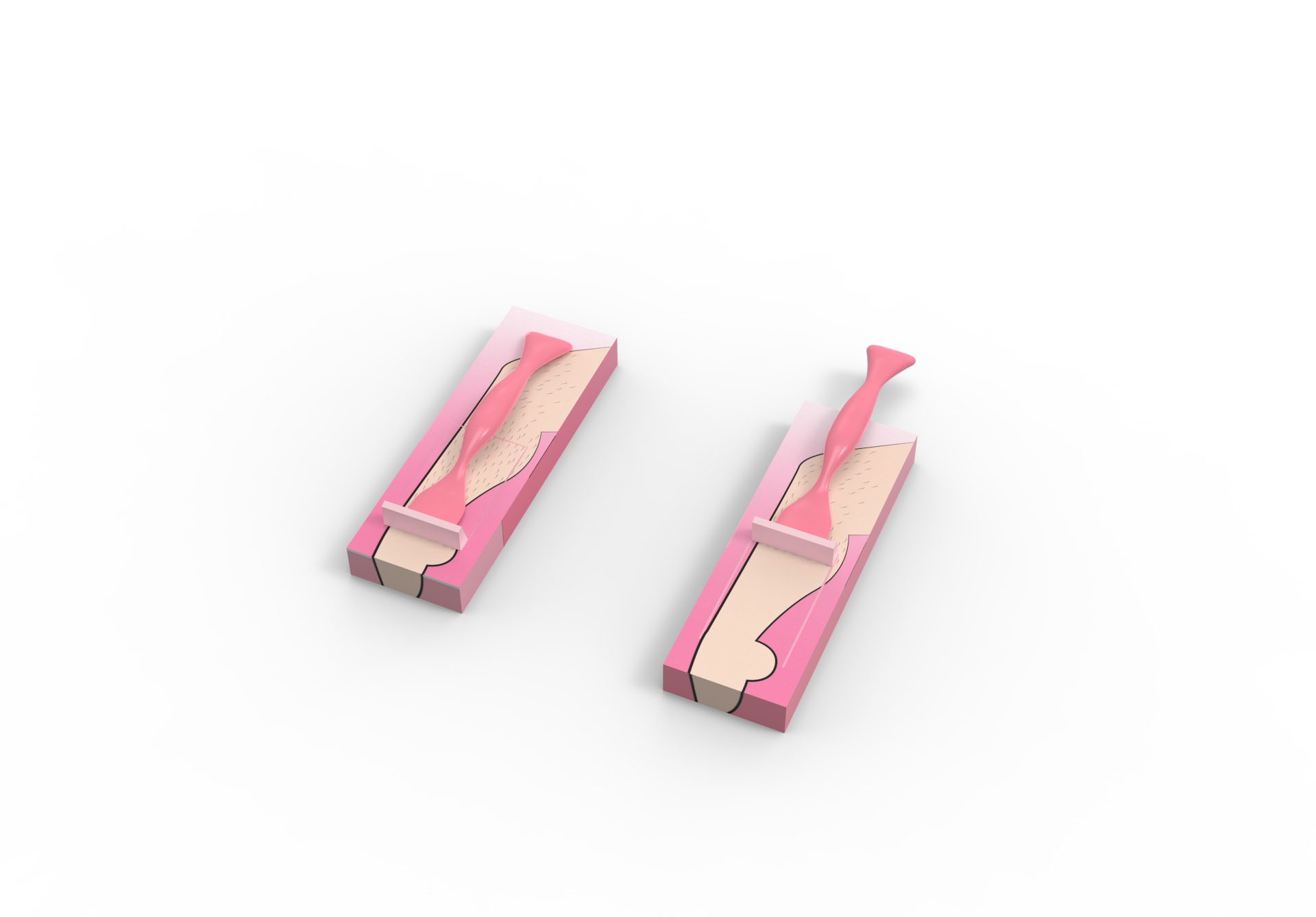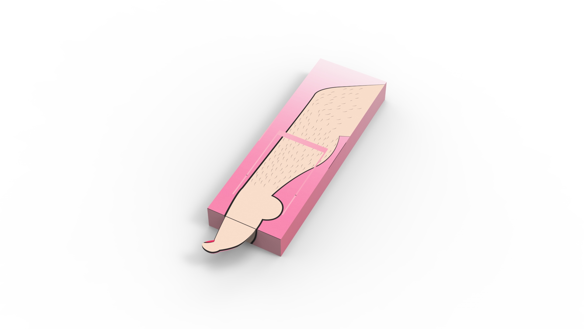 Obal na žiletku a náhradní holící hlavy. Žiletka je připevněná na vrchní straně obalu. Jednoduchým pohybem do středu krabičky, znázorňujícím holení nohy a následným vytažením se dá sejmout z krabičky. Uvnitř obalu se nachází výstuha, která slouží k upevnění náhradních hlavic. Krabička je jednoduchého obdélníkového tvaru, který zajistí stohovatelnost v obchodě i skladnost v osobní skříňce.