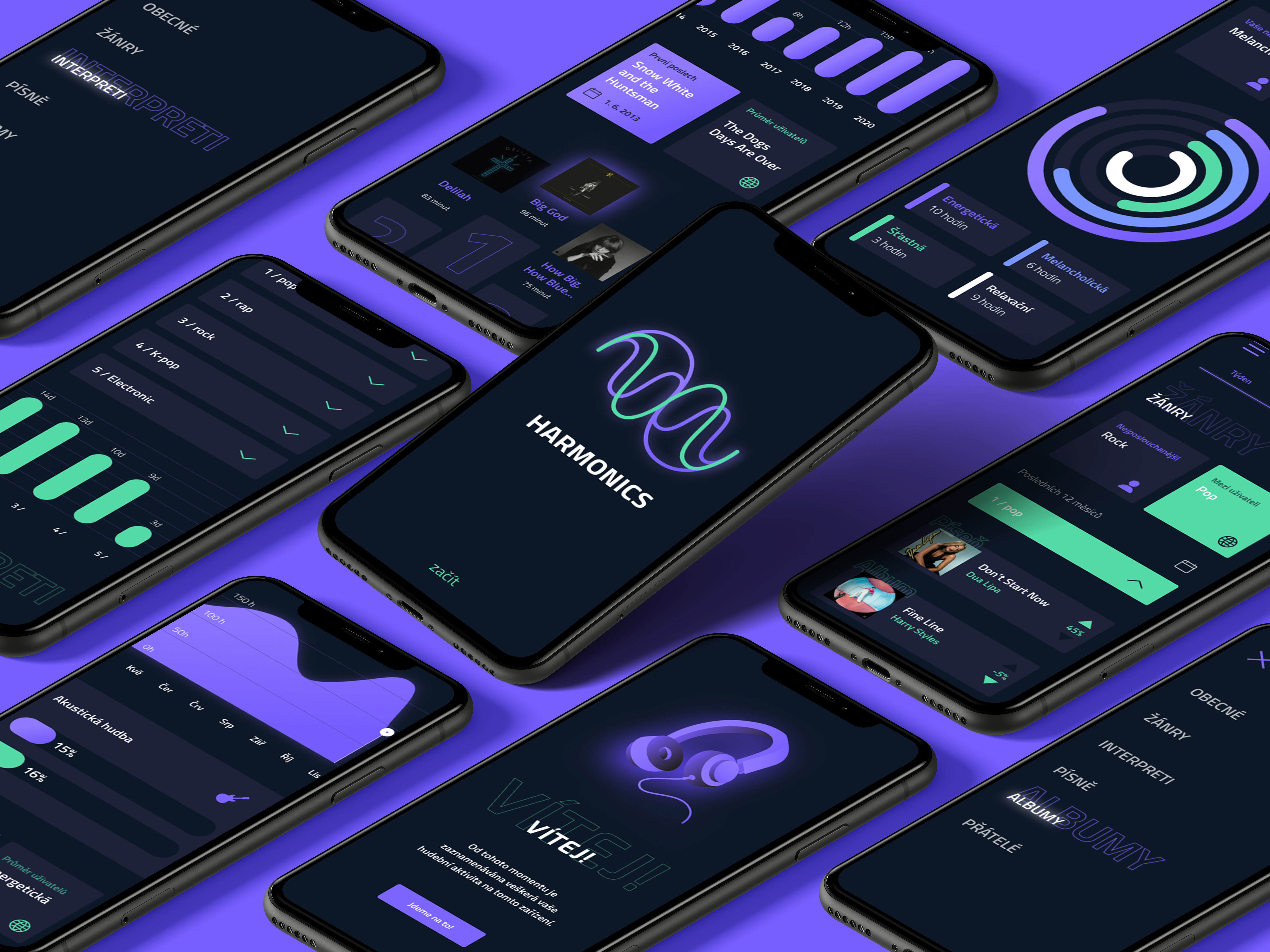 Infografická aplikace zaznamenávající hudební aktivitu na mobilu. Zvolila jsem tmavé pozadí se zářivými barvami jako je modrá a fialová, s tím že každá barva pracuje s rozdílnými daty. Hlavní prvek, podle kterého se uživatelé orientují, je horní lišta měnící časové období a velké tlačítka přepínající statistiky mezi mými a průměrem uživatelů. Chtěla jsem dosáhnout jednoduché přehlednosti a svěžího designu, který by neurazil žádnou věkovou skupinu, protože hudba je populární v každém věku.