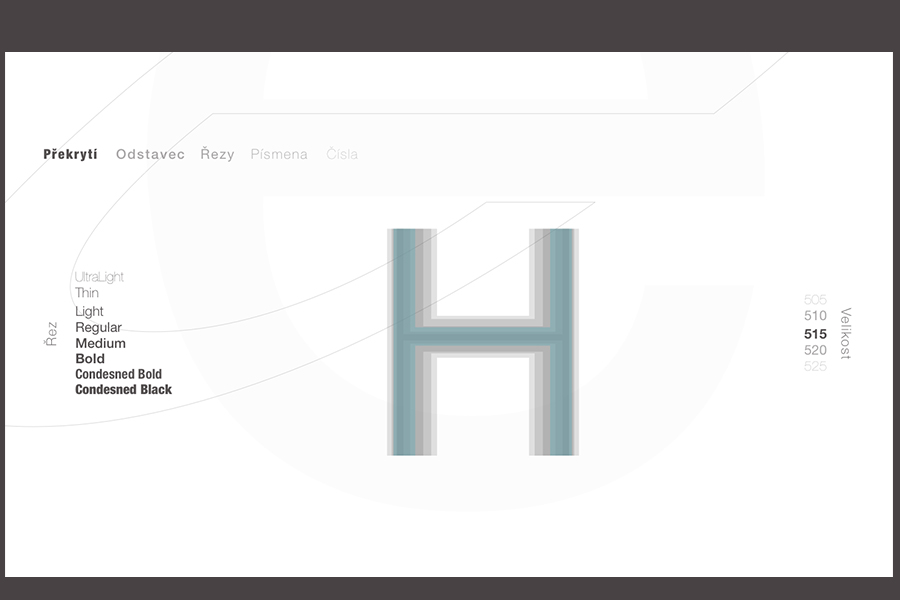 Na webu se písmo prezentuje ve všech svých řezech, které můžeme podle libosti měnit společně s prokladem a velikostí – tak se nám dostane dokonalého obrazu o tomto písmu.