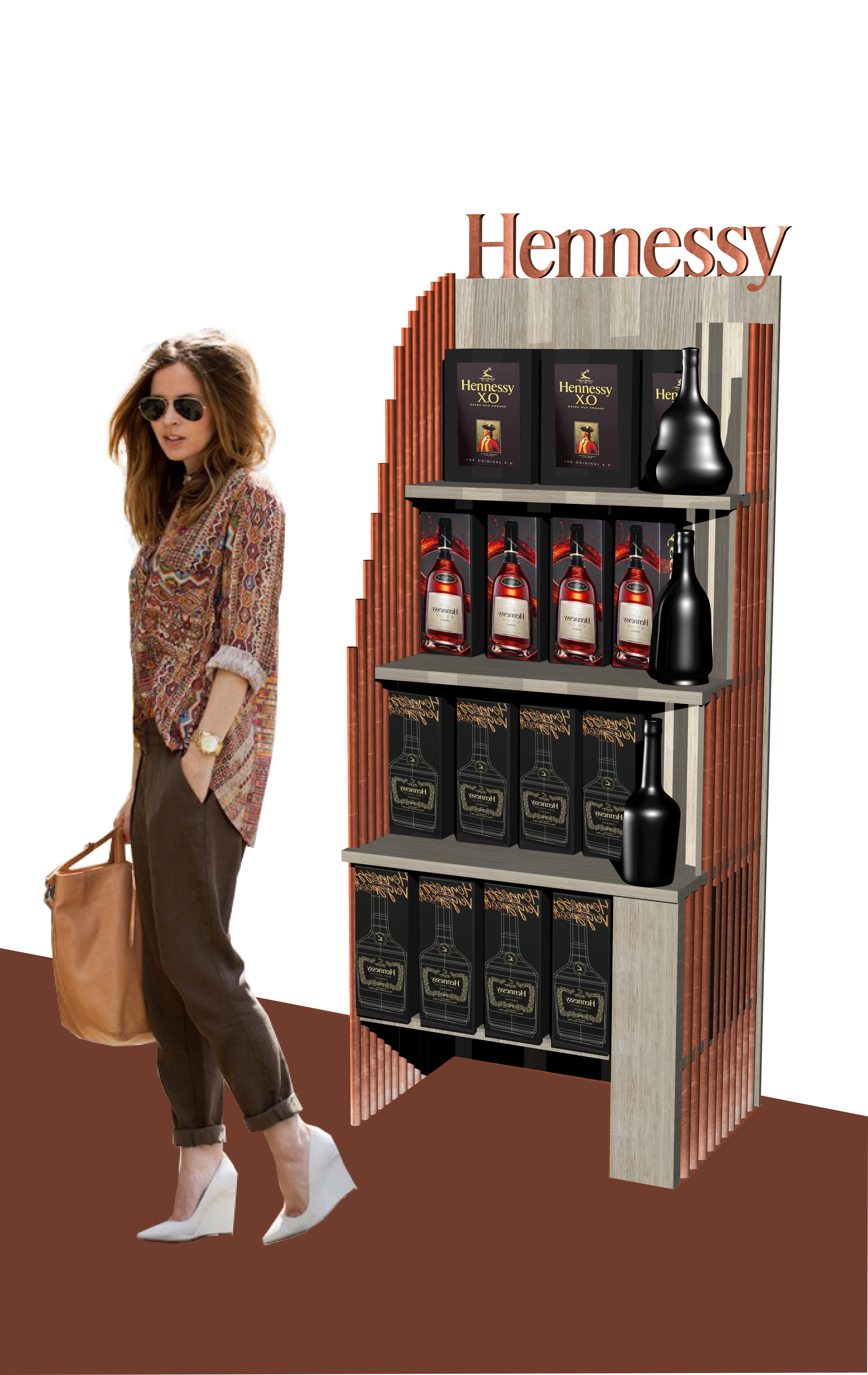 Reklamní odebiratelný stojan pro koňaky značky Hennessy. Řešení obsahuje 34 krabic a 3 makety produktů. Spojení dubového masivu s měděnými tyčkami, které dodávají gradaci celého stojanu.