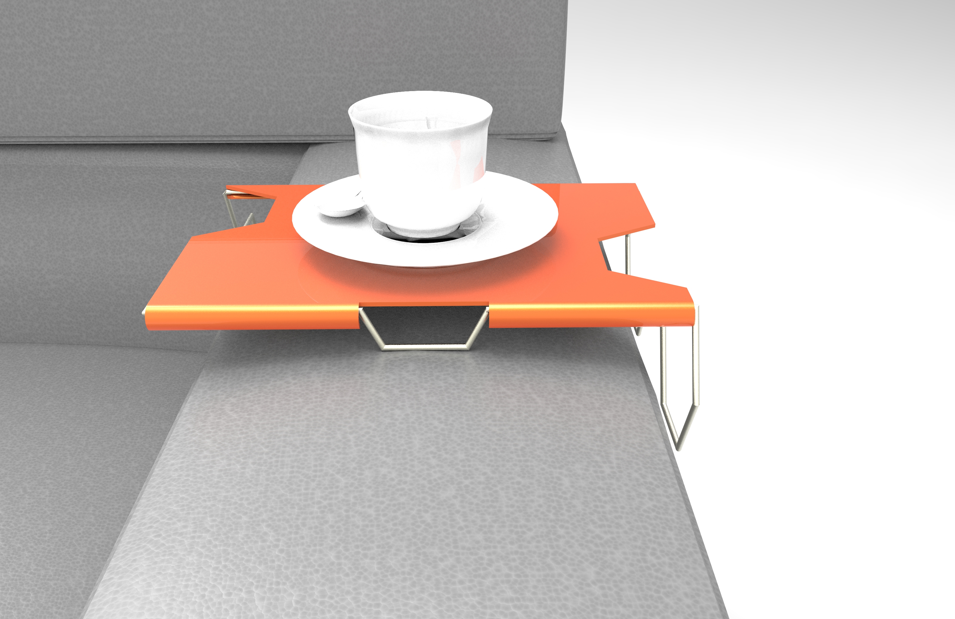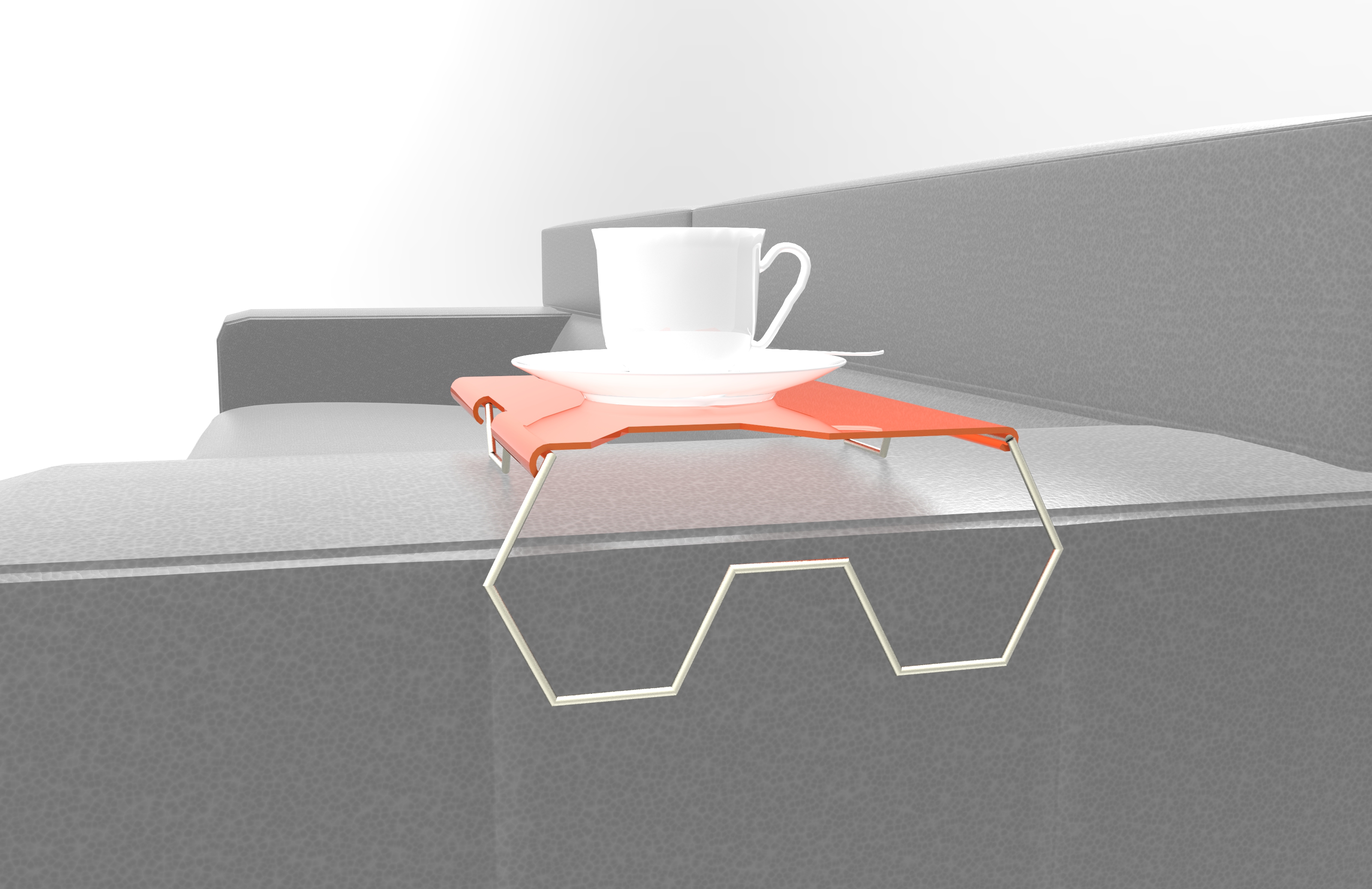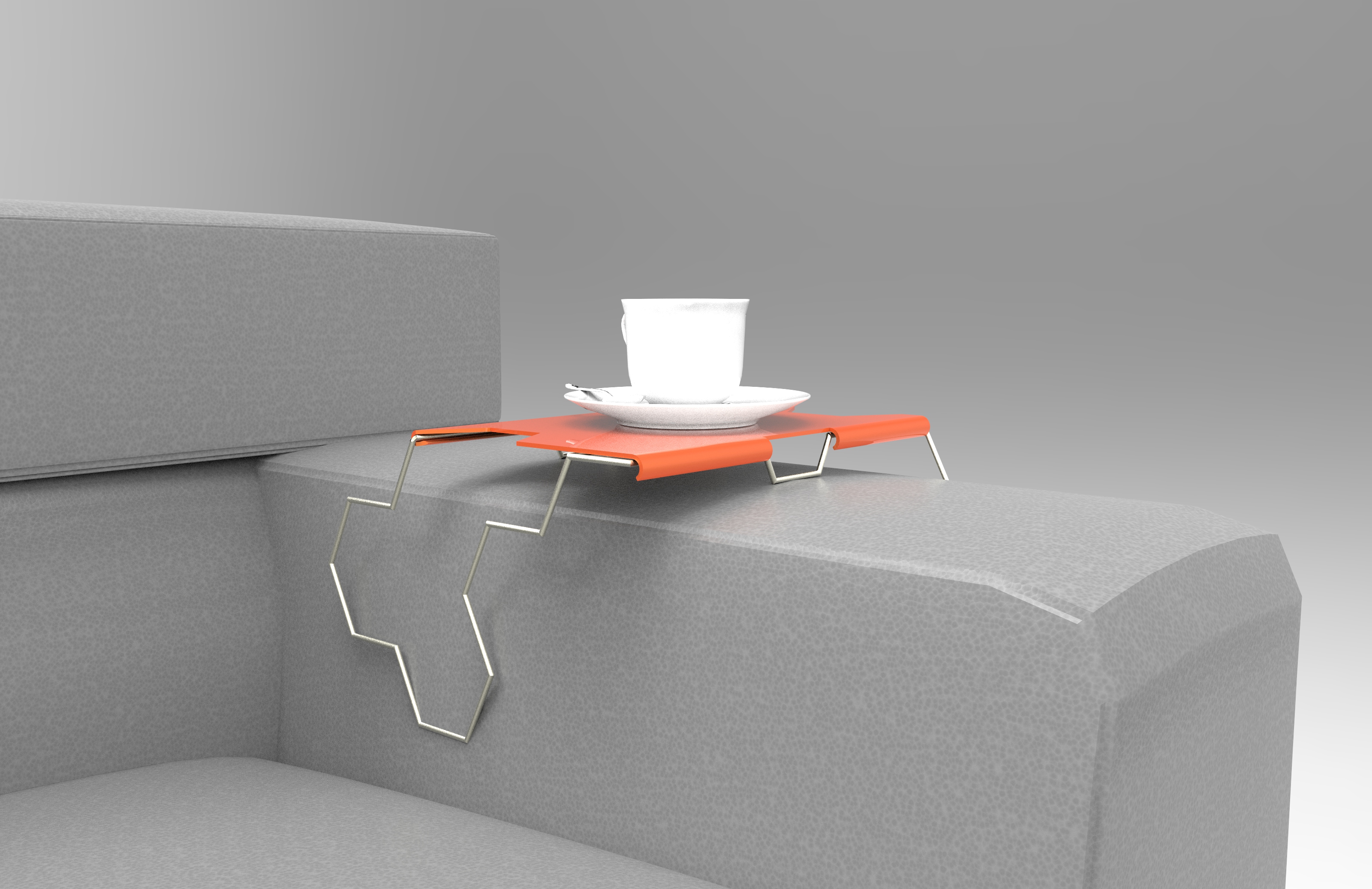 Odkládací stolek, který se dává na područku u pohovky, aby vytvořil odkládací prostor. Vyrobeno z ohýbaného drátu.