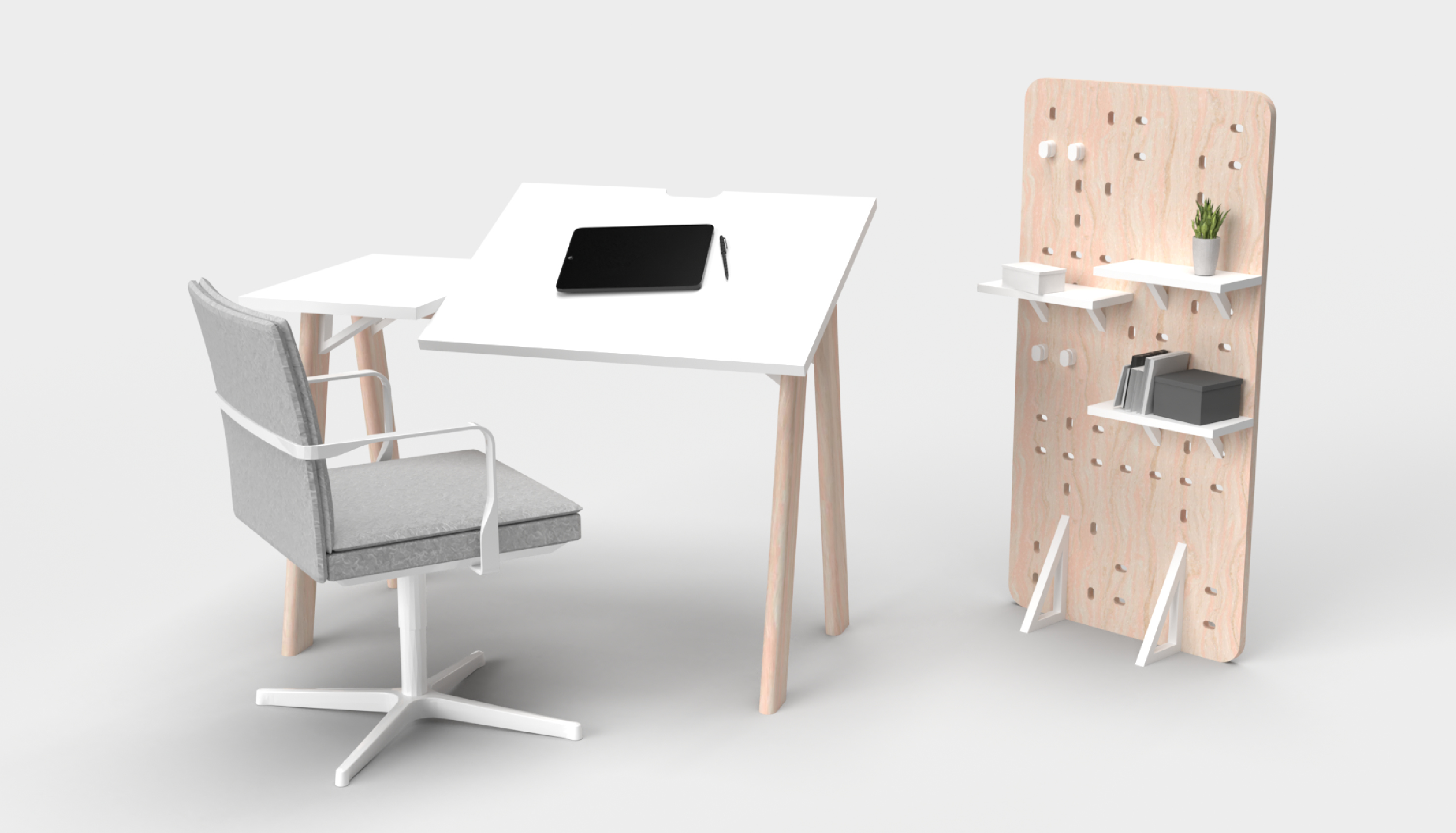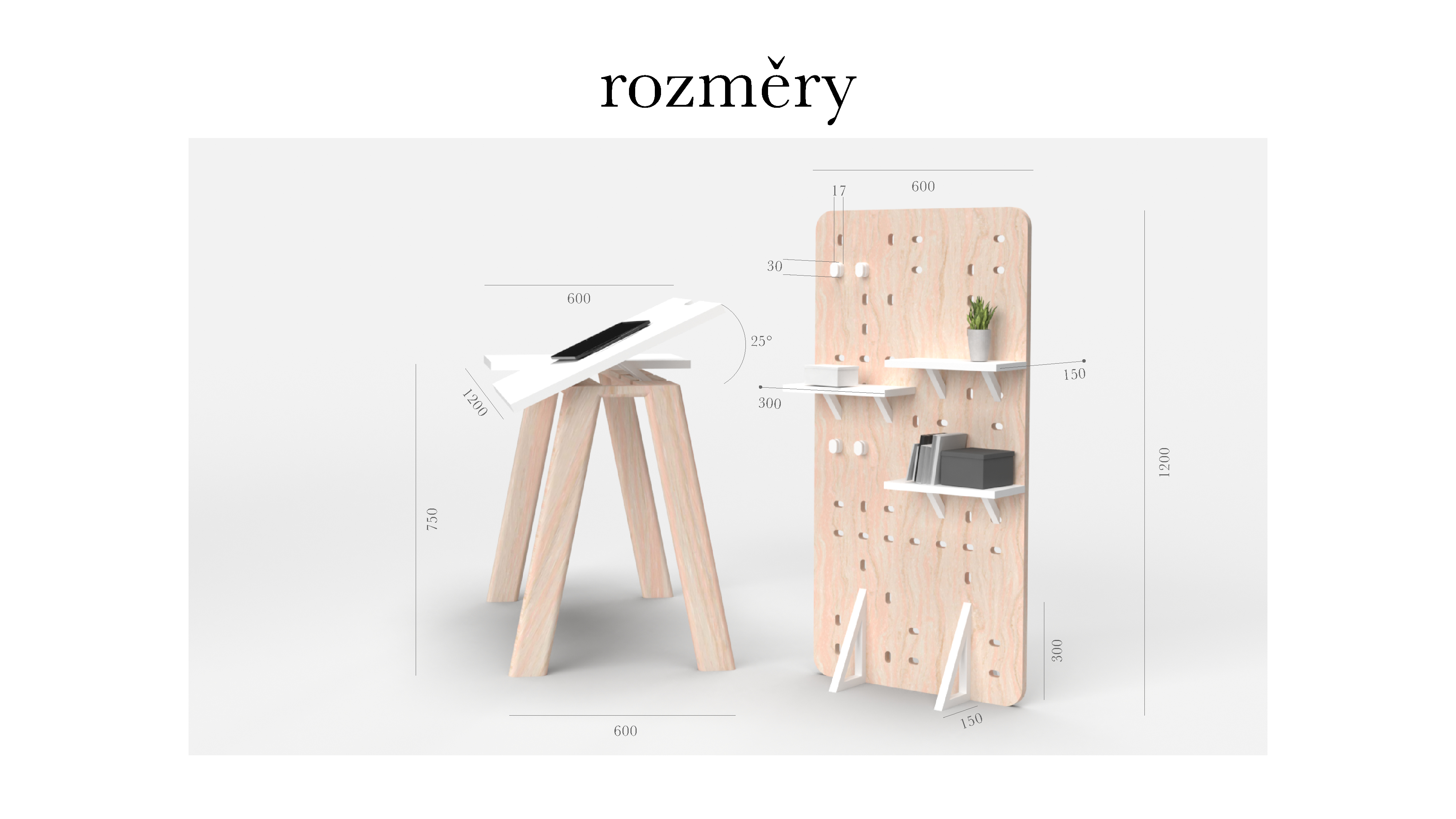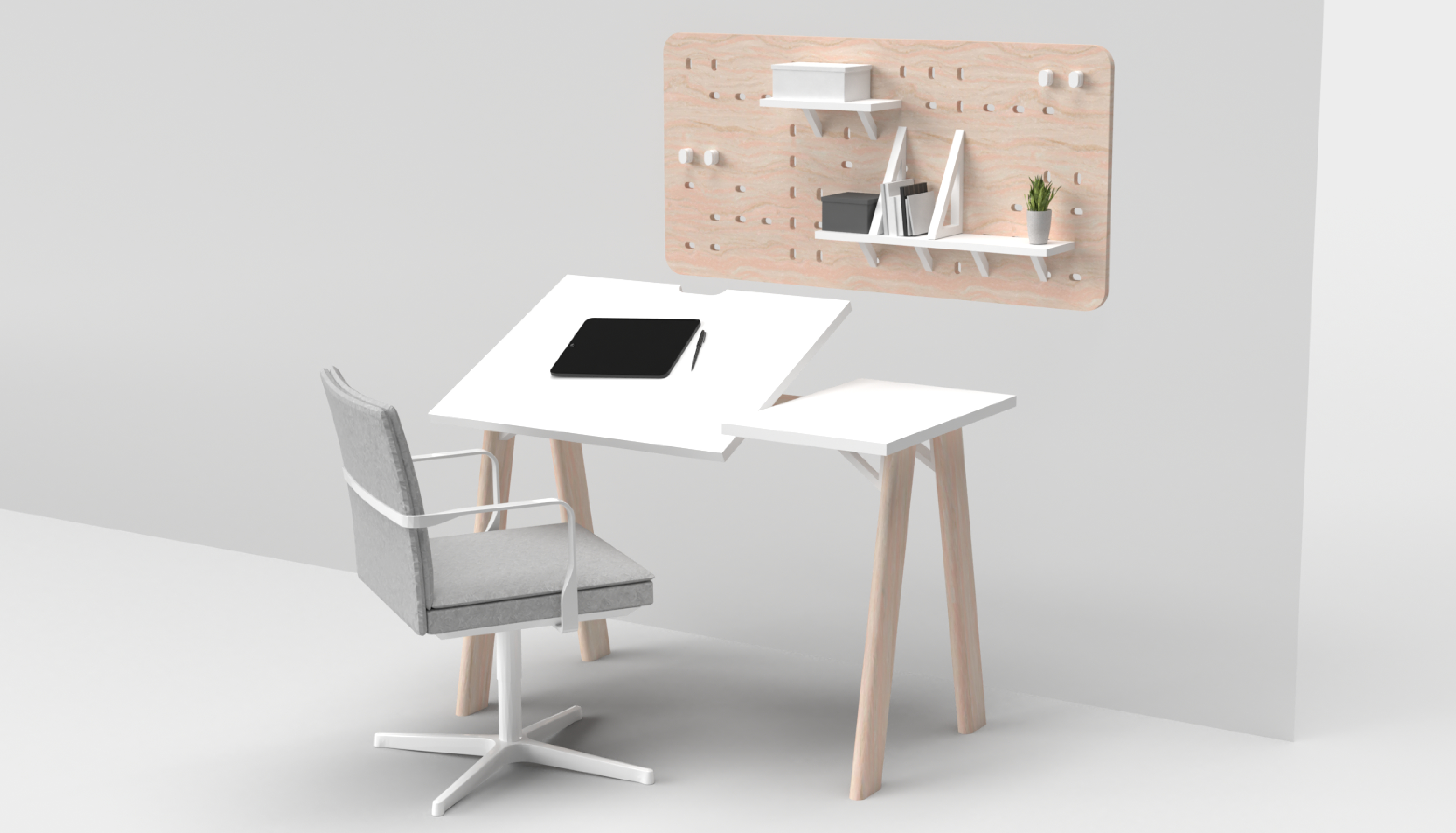Pracovní stůl s rozdělenou pracovní deskou je možné naklopit do úhlu 25˚ pro příjemnější kreslení. Konstrukci stolu díky osově souměrným výřezům je možné přizpůsobit pro práci leváka i praváka. Materiálová skladba je kombinace masivu na konstrukci a lehčené pracovní desky z DTD a voštiny pro snadnější manipulaci.