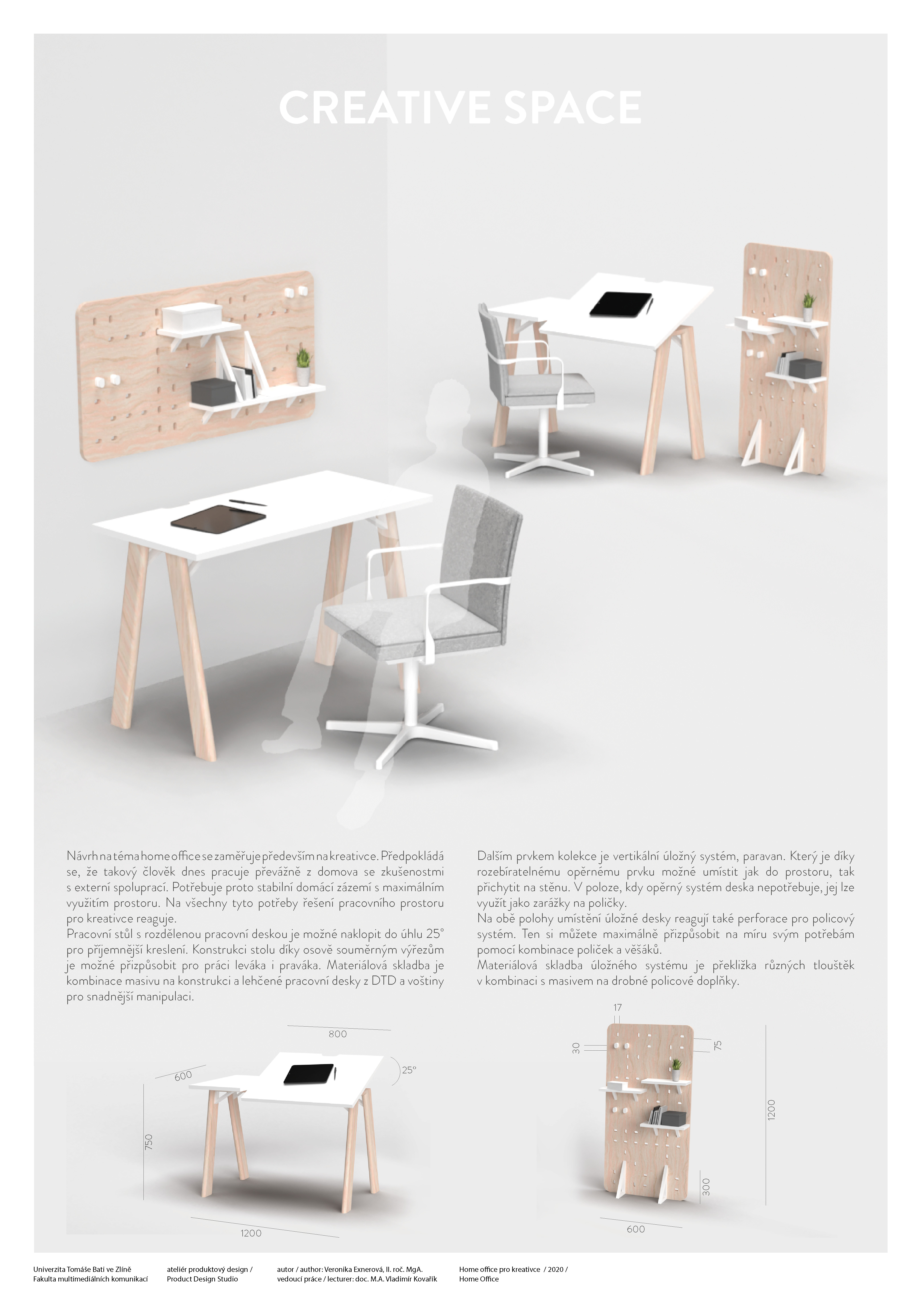 Návrh na téma home office se zaměřuje především na kreativce. Předpokládá se, že takový člověk dnes pracuje převážně z domova se zkušenostmi s externí spoluprací. Potřebuje proto stabilní domácí zázemí s maximálním využitím prostoru. Na všechny tyto potřeby řešení pracovního prostoru pro kreativce reaguje.