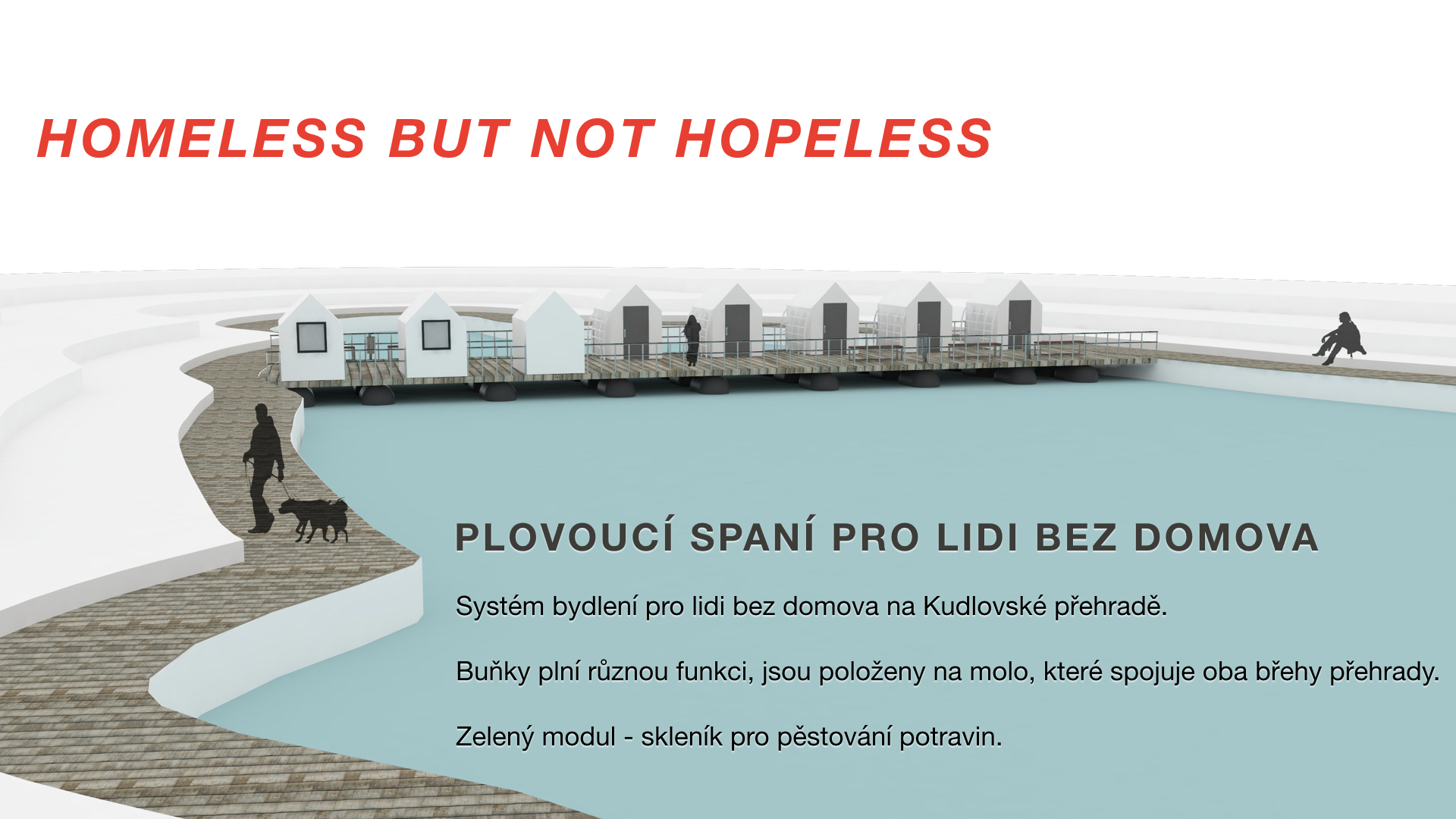 Systém bydlení pro lidi bez domova na Kudlovské přehradě. Buňky plní různou funkci, jsou položeny na molo, které spojuje oba břehy přehrady. Zelený modul - skleník pro pěstování potravin.