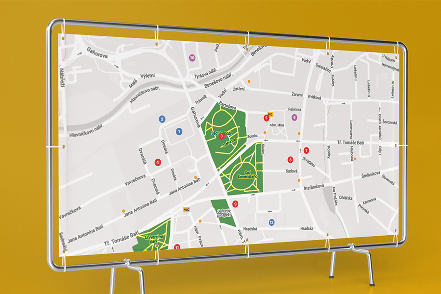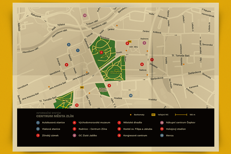 Návrh informačních map pro návštěvníky Zlína. První návrh seznamuje návštěvníka se Zlínskými čtvrtěmi a zajímavými a důležitými místy města. Návrh druhý pak zobrazuje zajímavosti a atrakce přímo v městském centru.