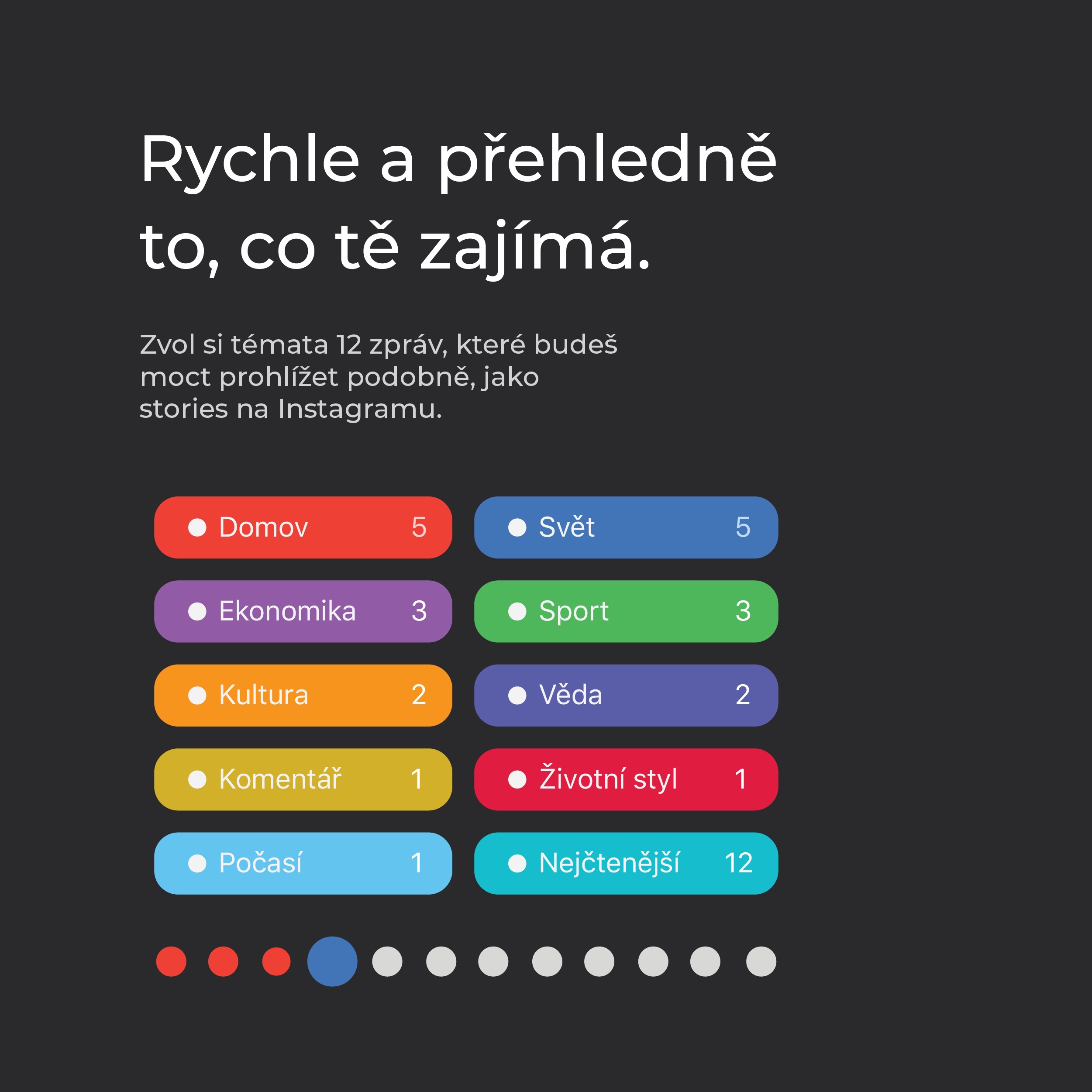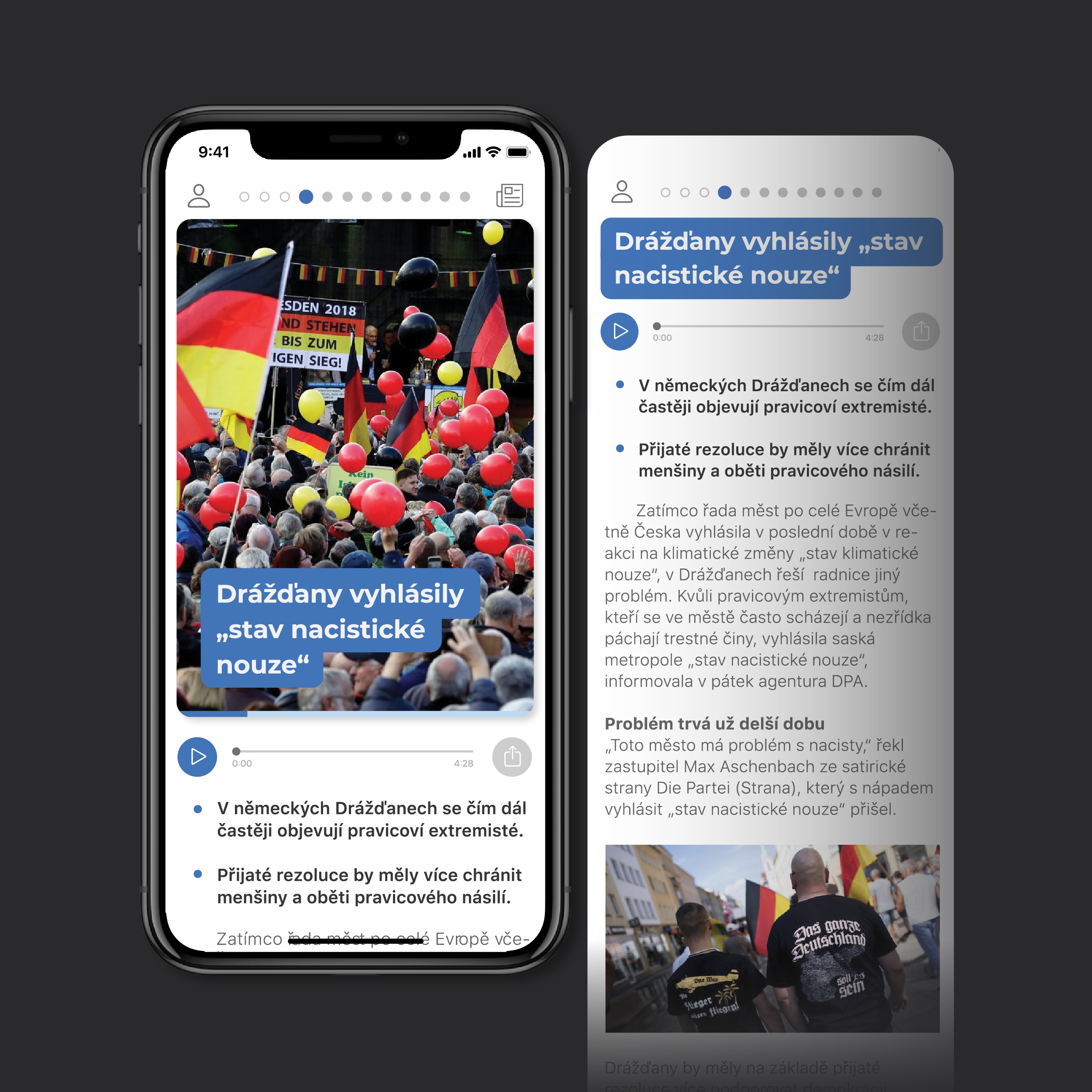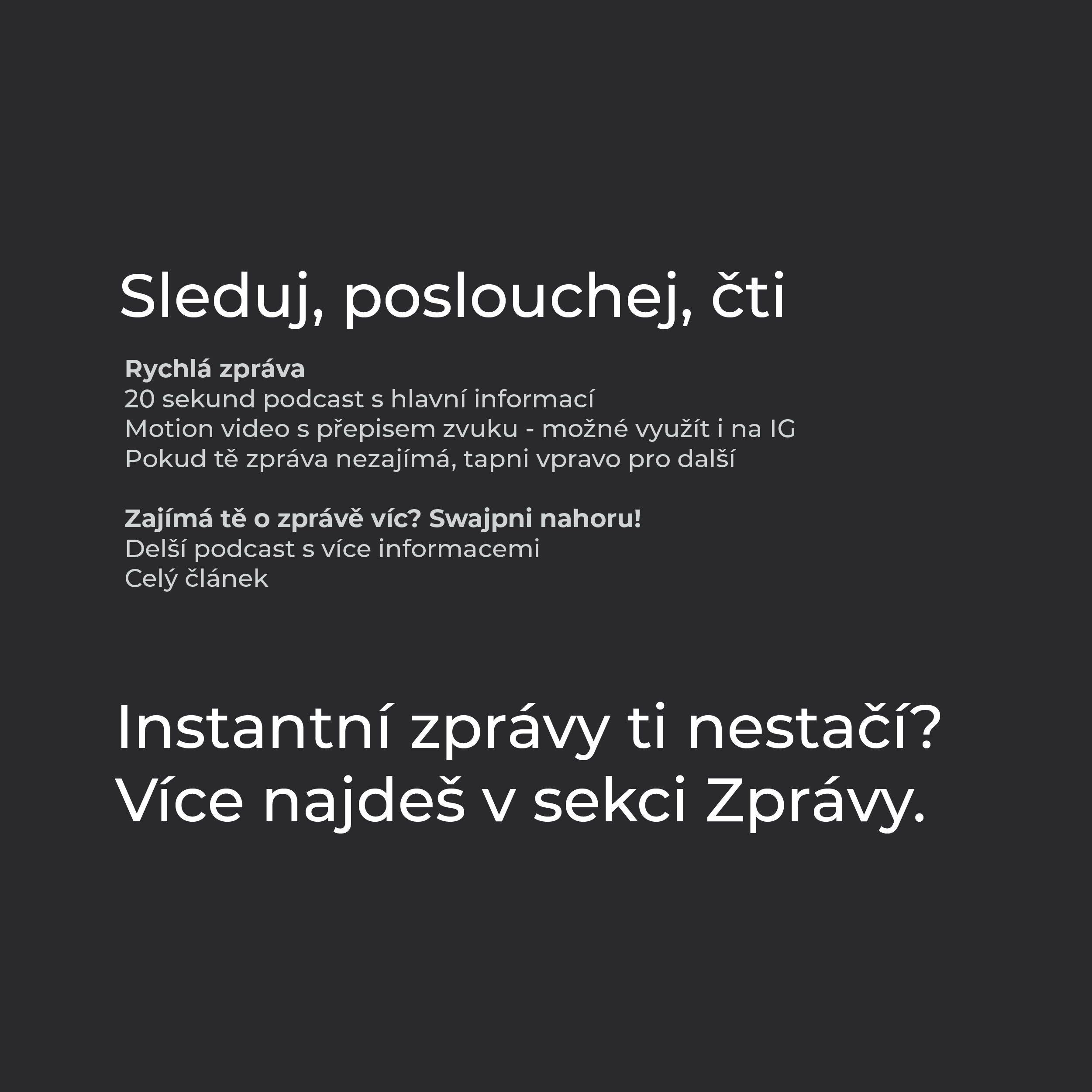 Aplikace, která cílí především na mladší uživatele, kteří jsou zvyklí každodenně používat sociální sítě. Tato aplikace je inspirována funkcí Instastories od Instagramu a rozšiřuje ji o dostupné technologie, které může iRozhlas využít. Sleduj, poslouchej nebo čti - je to na tobě! Každá z tvých 12 personalizovaných Instanews se ti nejprve zobrazí v rychlém 15-20 sekundovém přehledu, který můžeš sledovat (přepis ve formě motion videa) nebo jen poslouchat. Pokud tě o dané zprávě zajímá více, stačí swajpnout nahoru a číst o ní více podrobností, nebo si pustit delší podcast. Pro uživatele, kteří mají rádi více zpráv, má aplikace také sekci Zprávy, kde naleznou všechny zprávy, které byly publikované na serveru iRozhlas. Výhodou pro iRozhlas také může být, že motion podklady, vytvořené pro InstaNews, bude moci využít při své komunikaci na sociálních sítích.