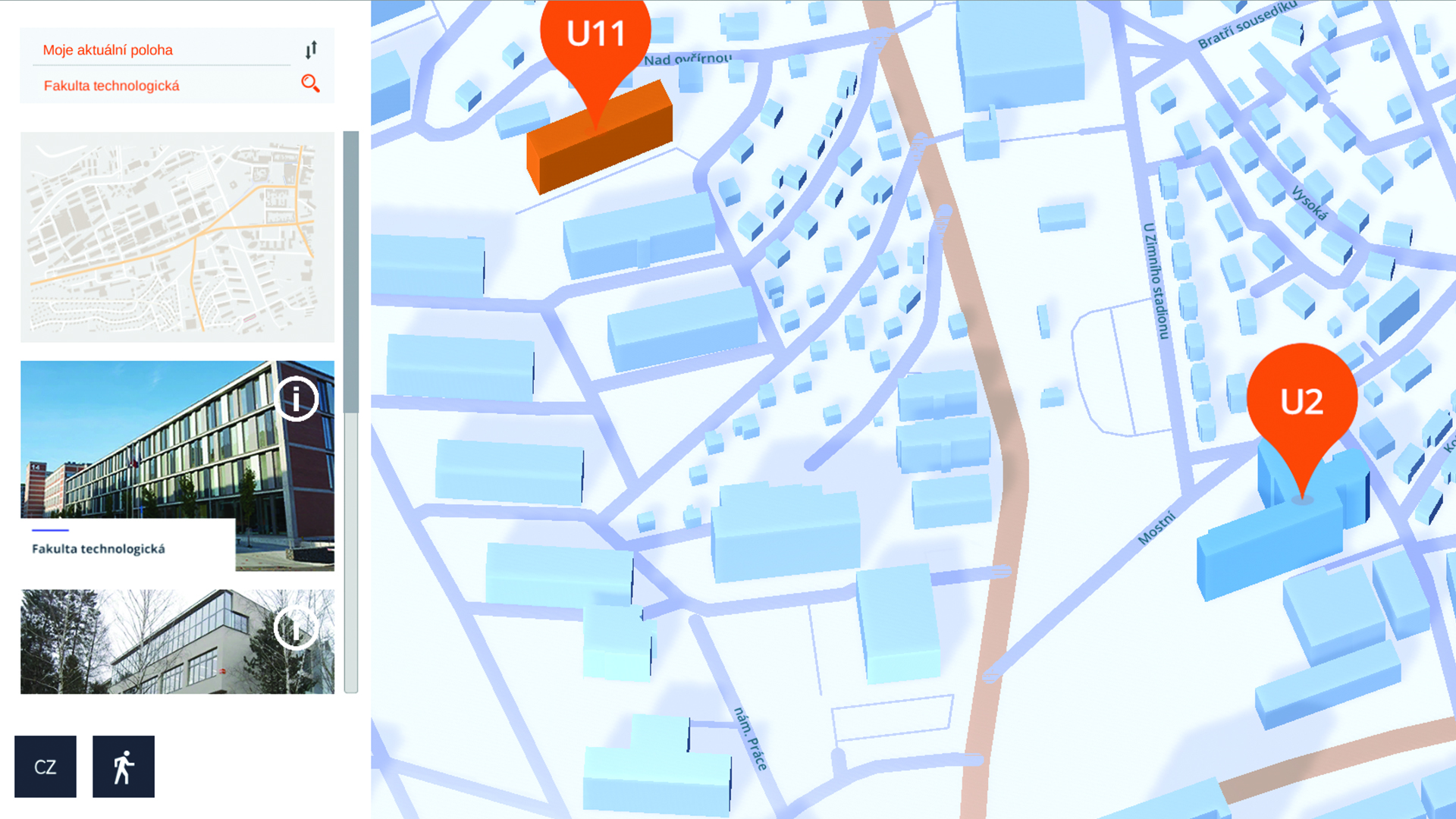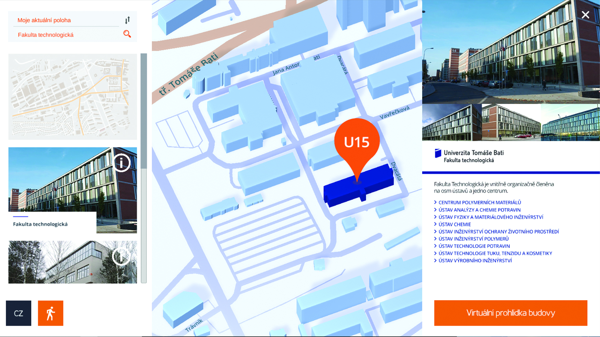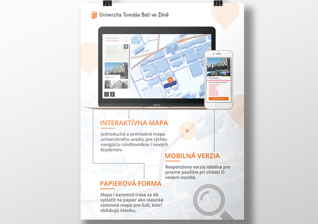 Prototyp interaktívnej mapy pre Univerzitu Tomáše Bati. Základ mapy tvorí 3D model, ktorý bol vykonštruovaný v programe Blender. Tento model mapy bol následne spracovaný v Unity3D, kde boli dotvorené všetky základné vizuálne vlastnosti ako farebnosť budov, ciest, označenie budov aj ulíc. Ku správnej funkčnosti prototypu bolo potrebné pripojiť i niekoľko scriptov. Keďže sa jedná o doplnok univerzitnej webstránky a nie samostatnej aplikácie, samotný výsledok je stavaný ako WebGL. Tento model sa však vďaka Unity3D dá jednoducho vystavať i na mobilné zariadenia ako responzívna verzia. Hlavnou inšpiráciou pre ortografický model mapy bol časopis Universalia, konkrétne jeho vydanie z roku 2014/2015.