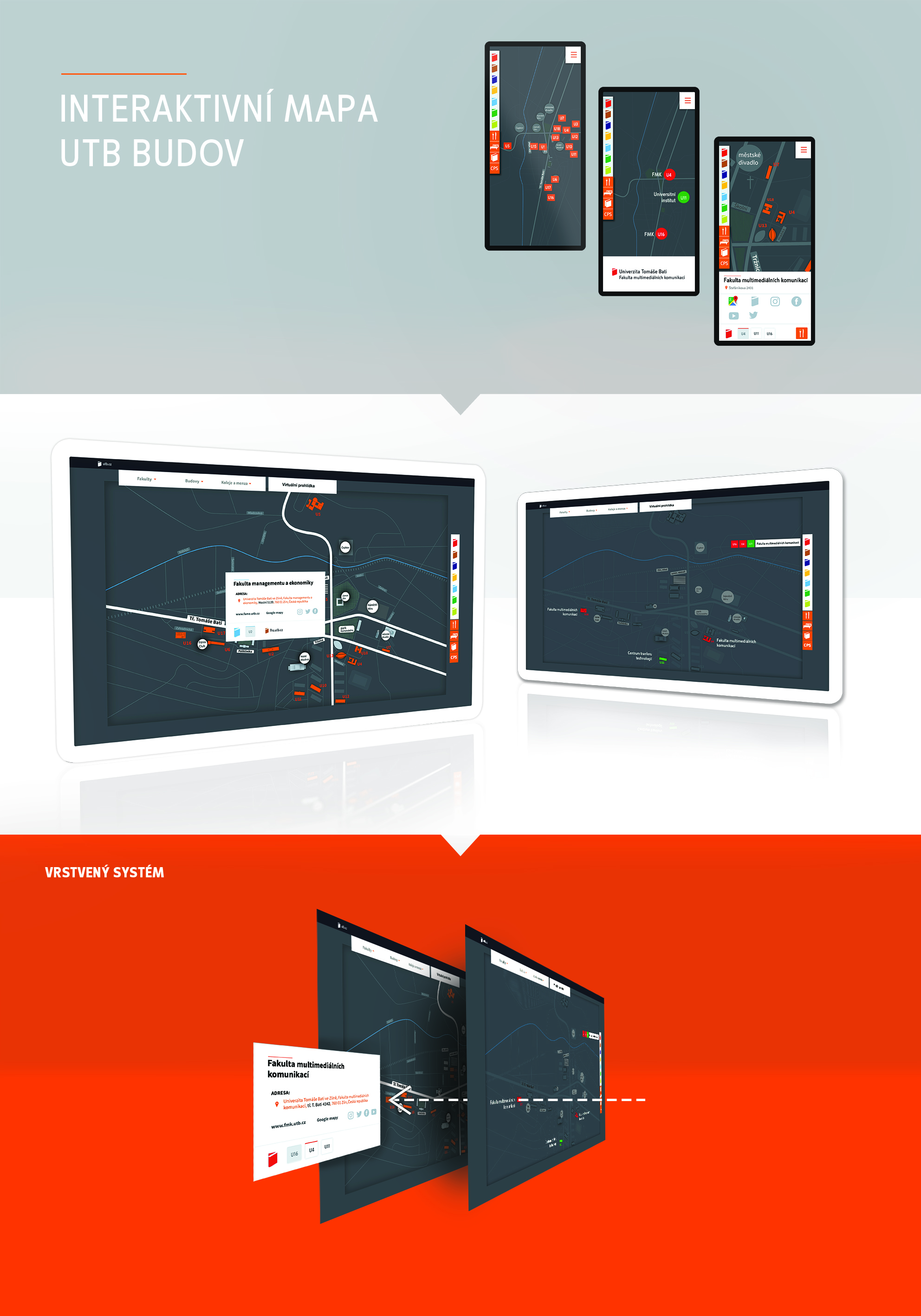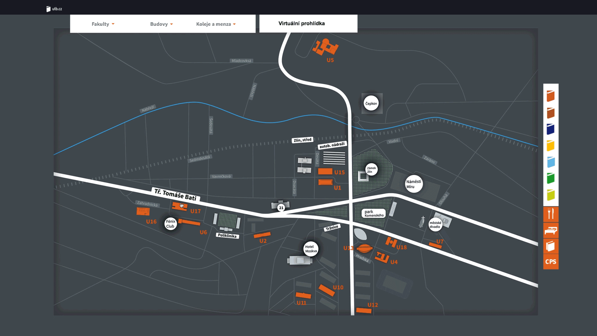 Samotná mapa má na sobě budovy, které při najetí myši zobrazí veškeré informace spojené s budovou (informace, web, trasu google atp.)