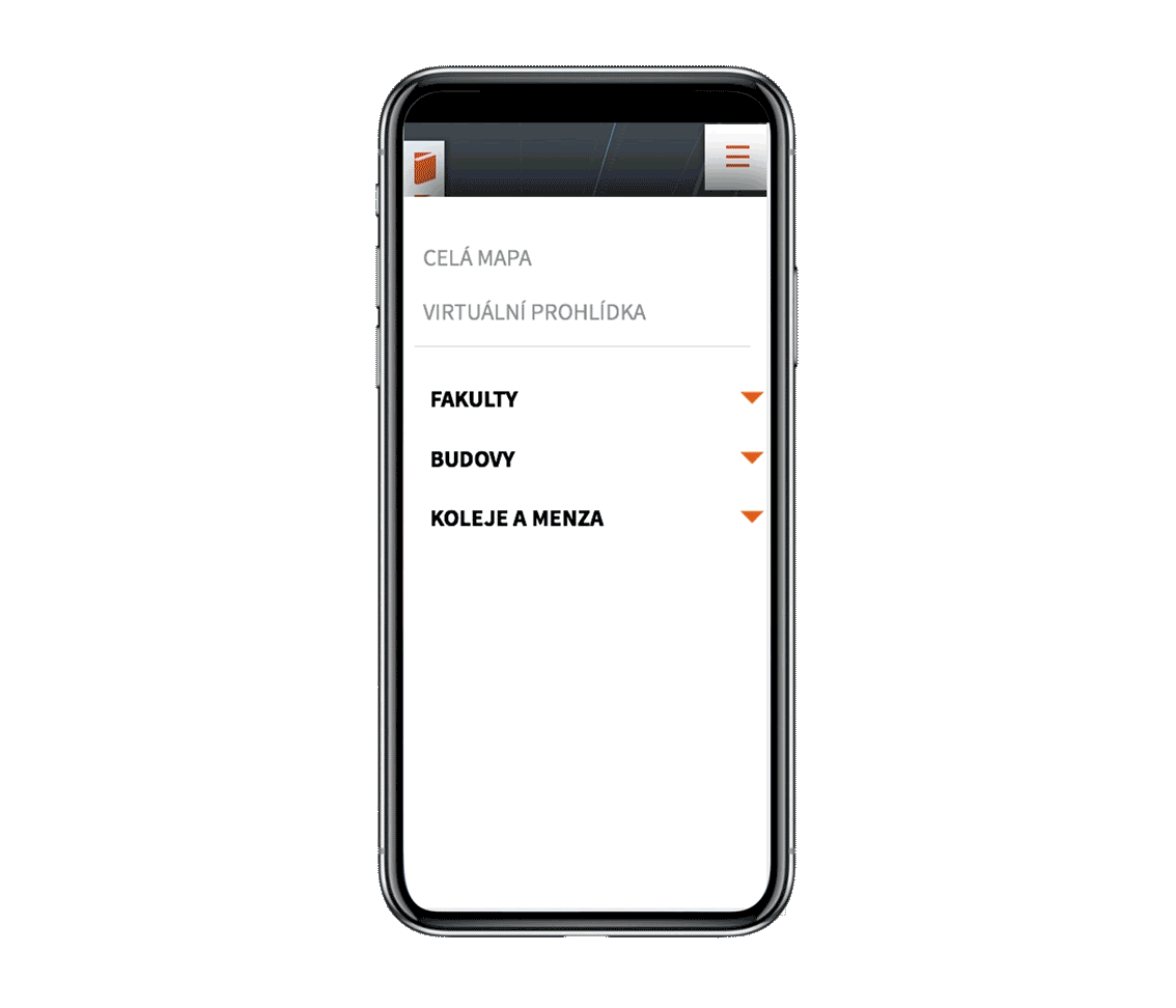 Menu nabízí textové rozdělení informací o budovách rozdělené na Fakulty, Budovy kde se samostatné budovy dělí abecedně, a menza a koleje.