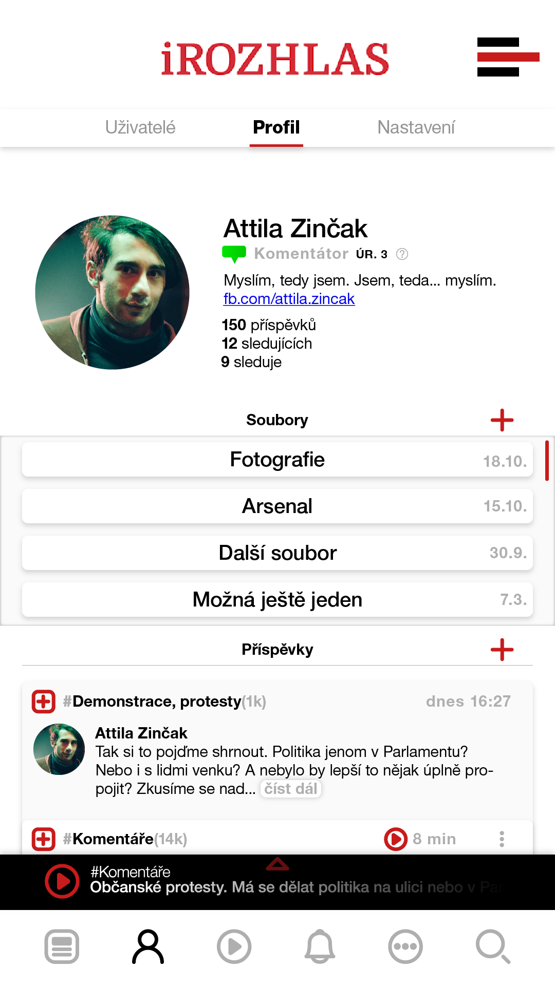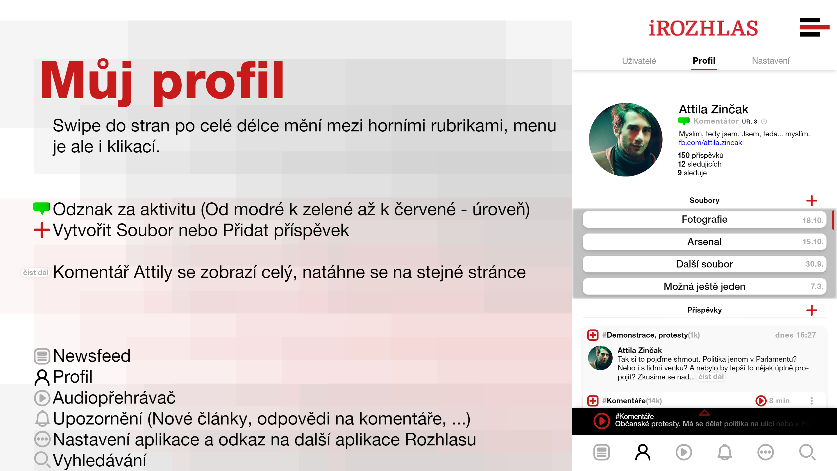 Možnost sledování přátel z jiných sociálních sítí, sledování témat a jiných uživatelů, kteří budou na svém profilu sdílet a komentovat články.