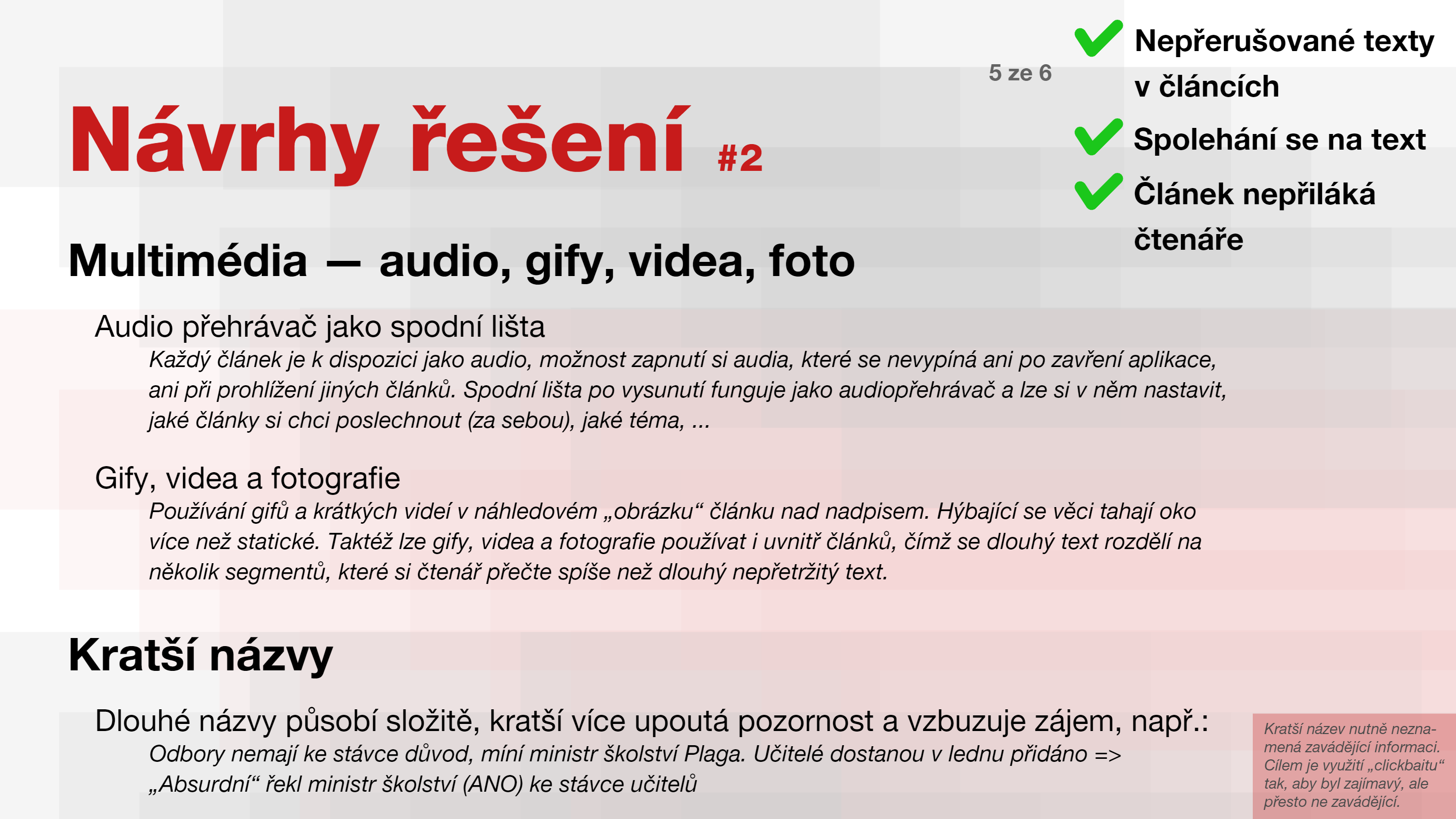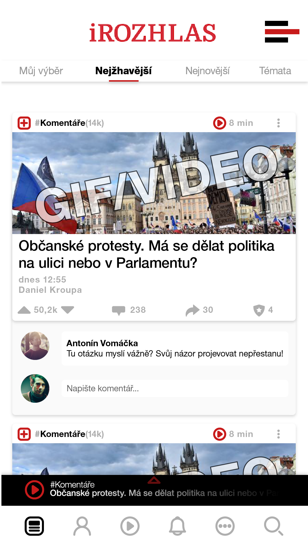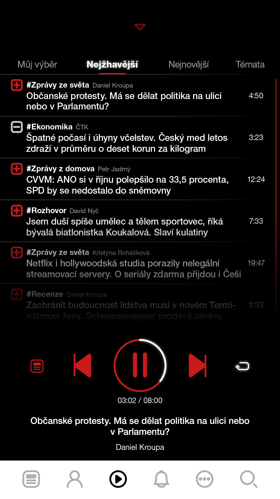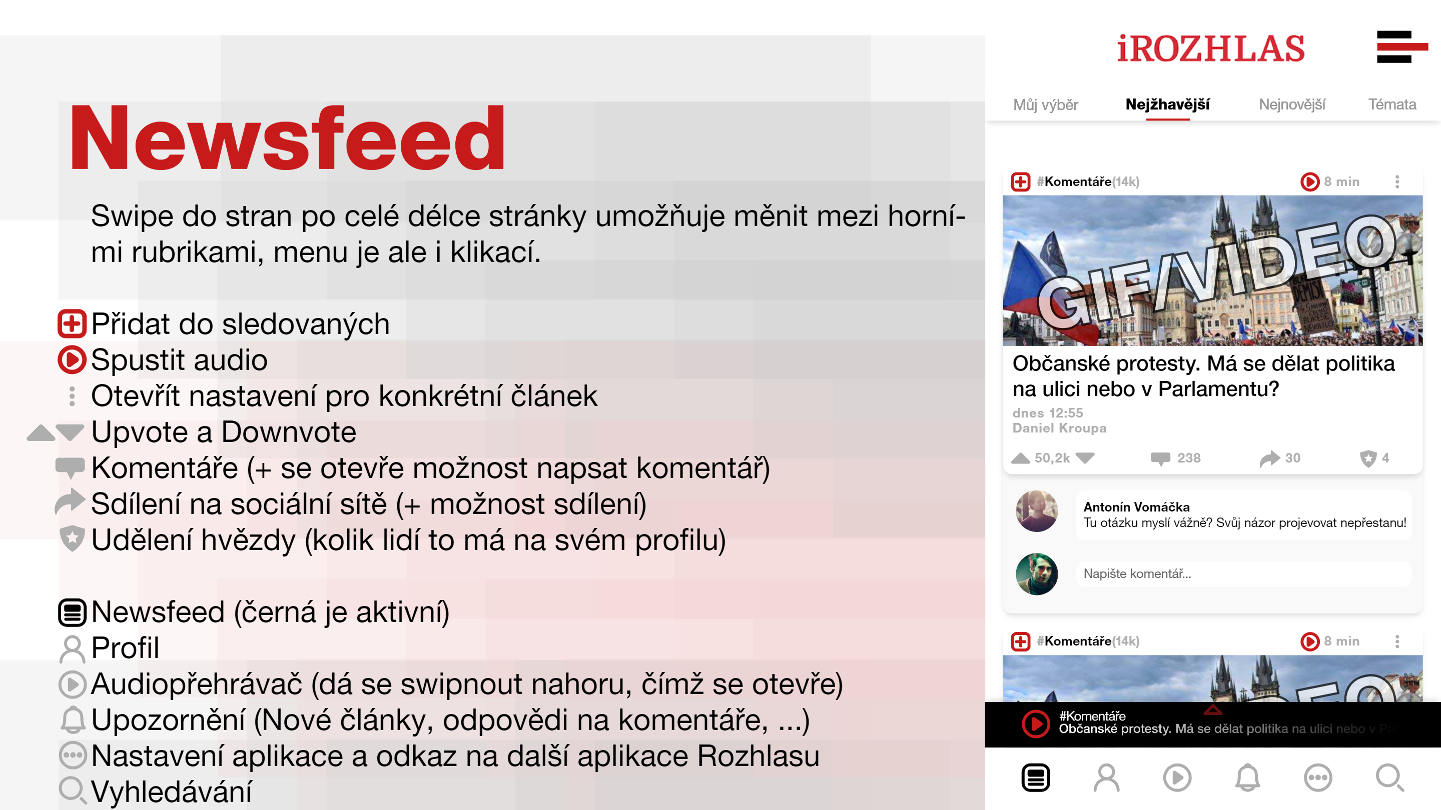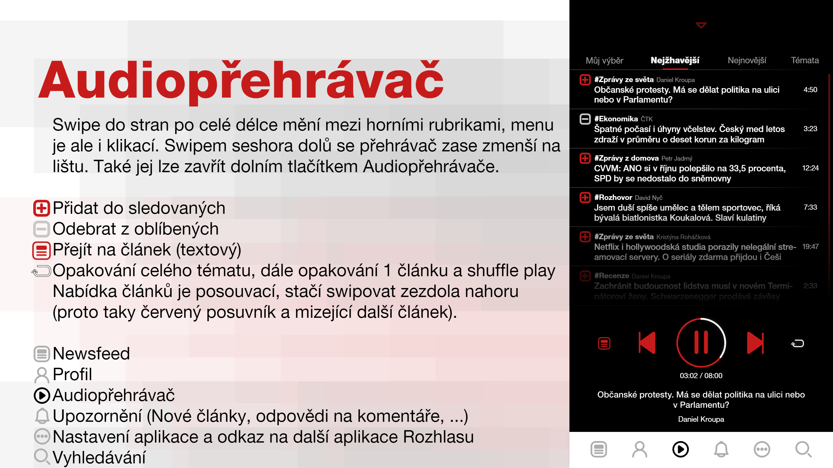 Personalizace feedu za pomocí sledování hashtagů, témat a konkrétních uživatelů. Všechny články k dispozici zároveň i jako audiostopa s přehrávačem.