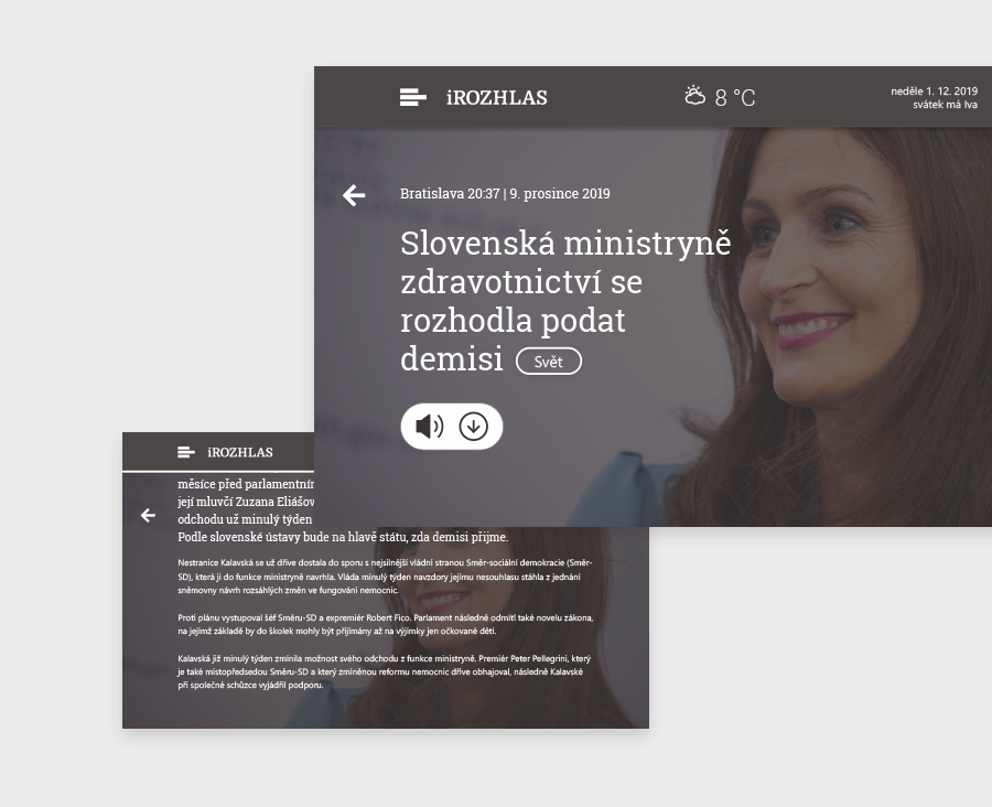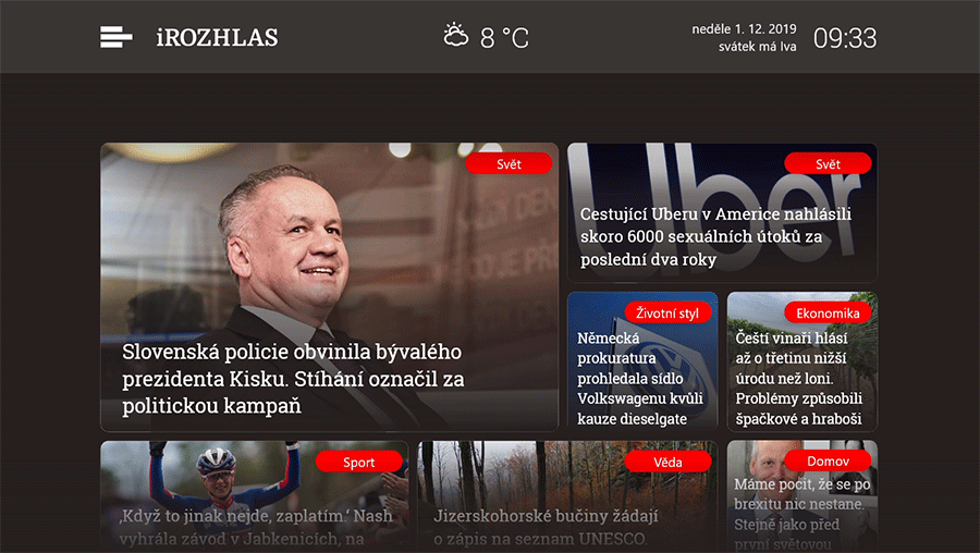 Kategórie v aplikácií sú zvolené pomocou mobilnej verzie. Aplikácia pre hybridnú televíziu je zjednodušená s dôrazom na pohodlné používanie ovládačom televízie. Pre šetrenie zraku v prípade používania HbbTv aplikácie v noci som zvolila tmavý podklad pre šetrenie zraku v kontraste s bielym písmom pre jednoduchú čitateľnosť textu. Červenú som používala len ako doplnkovú farbu. Na koncept som sa dívala očami diváka, mojim cieľom bolo prispôsobenie sa jeho potrebám.