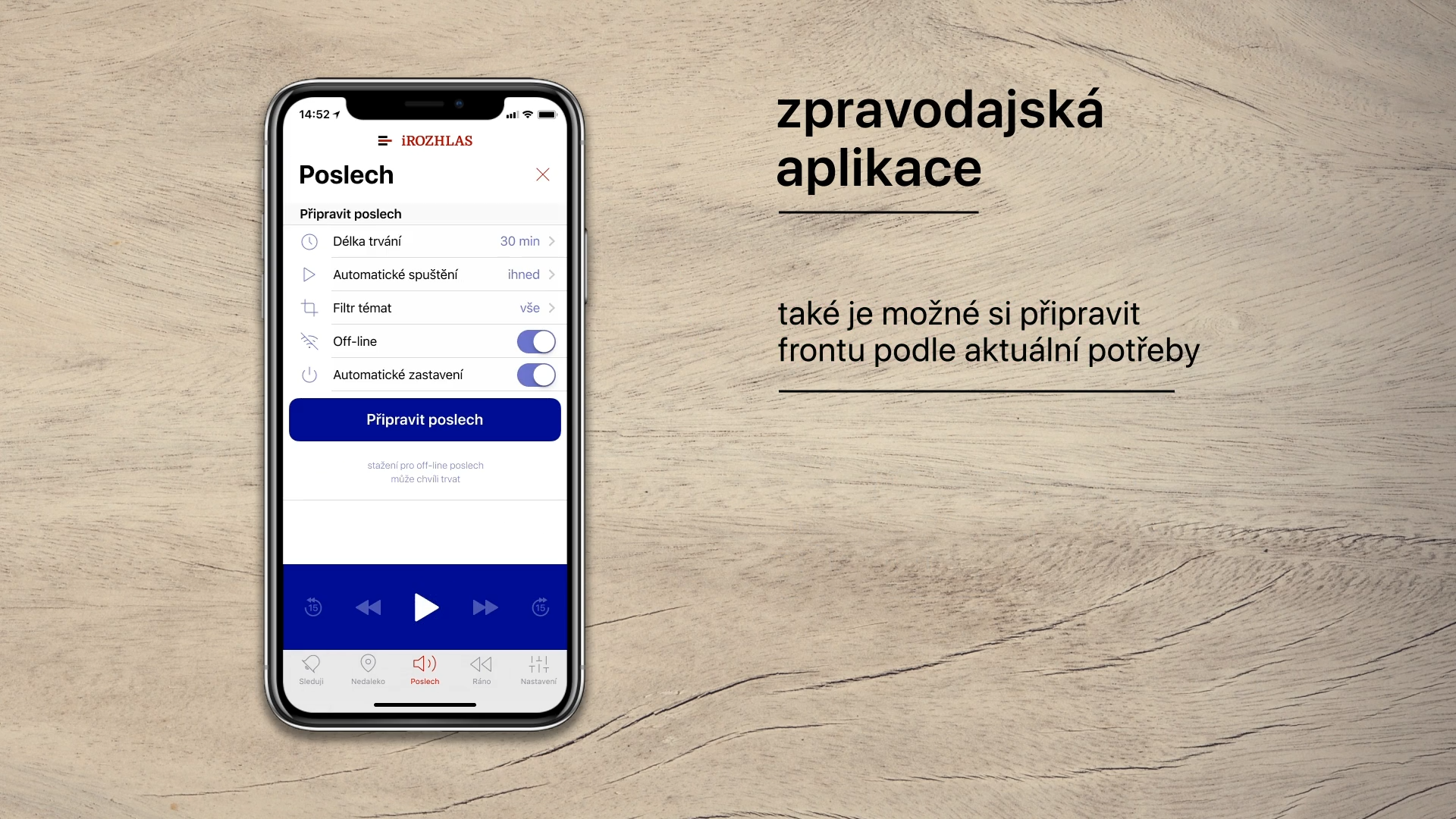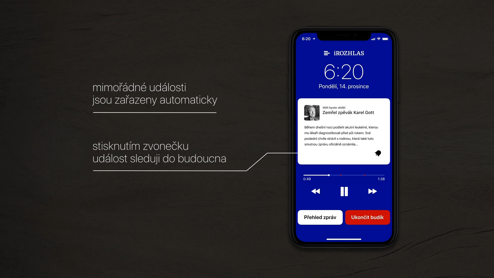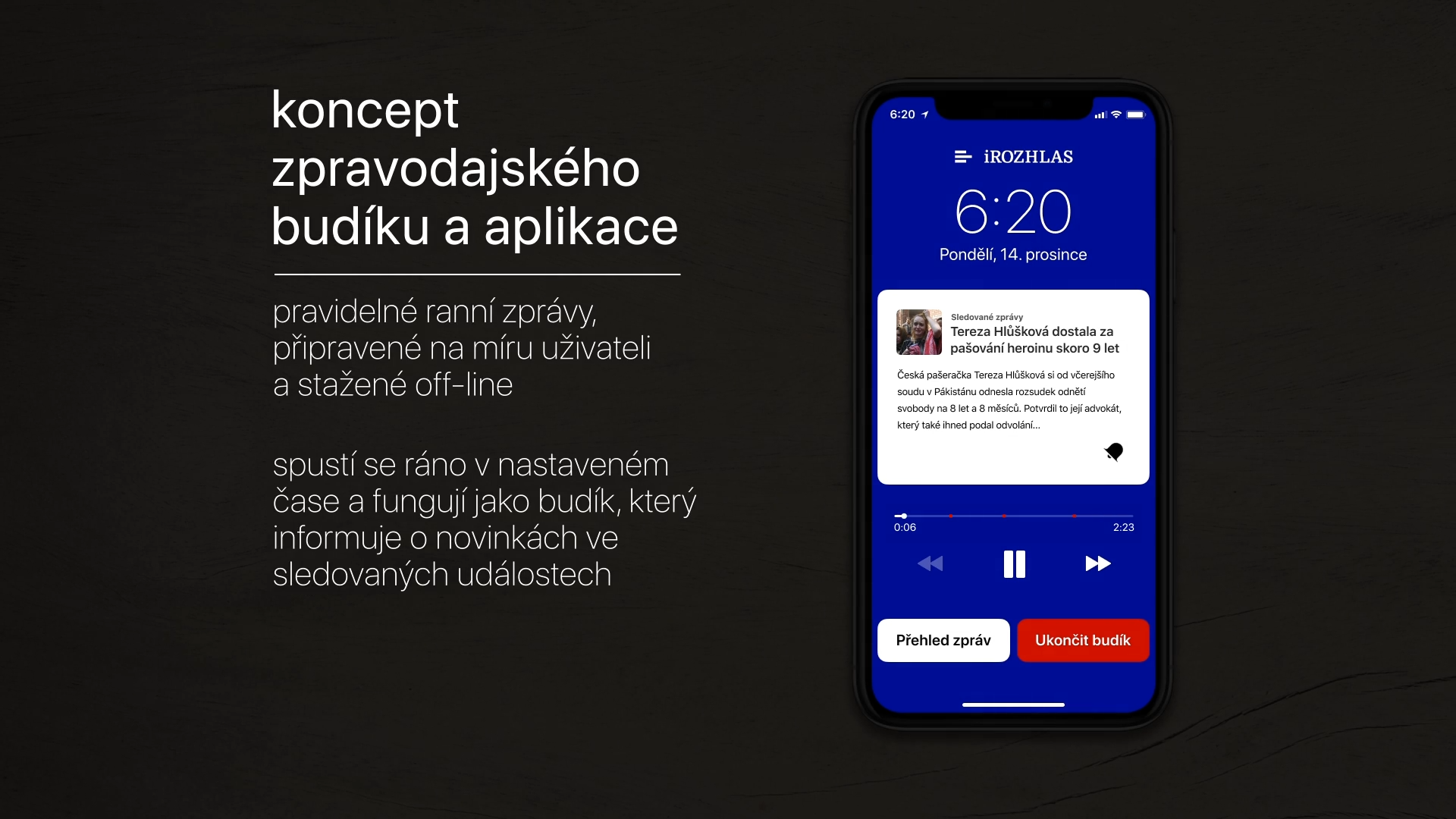 Jak dostat zpravodajství mezi denní rituály uživatele? V konceptu pro Český rozhlas a jejich zpravodajský server iRozhlas.cz pracuji s funkcí budíku, který ráno stáhne krátké audio zprávy, jež uživatele mohou zajímat (na základě personalizace) a následně je ve stanovený čas přehraje spolu se znělkou a uvítáním do nového dne. Součástí může být i předpověď počasí a zpráva o dopravní situaci (obojí na základě polohy zařízení). K uživateli se tak dostane pouze ten obsah, který jej skutečně zajímá (sledování dlouhodobých událostí a kauz), navíc je ranní vstávání hned zajímavější. Kromě událostí, které se staly, lze uživatele i upozornit na to, co bude probíhat během dne (plánovaná jednání, volby, kulturní a jiné akce). Budík je funkcí zpravodajské aplikace, která slouží ke čtení a poslechu zpráv během dne.
