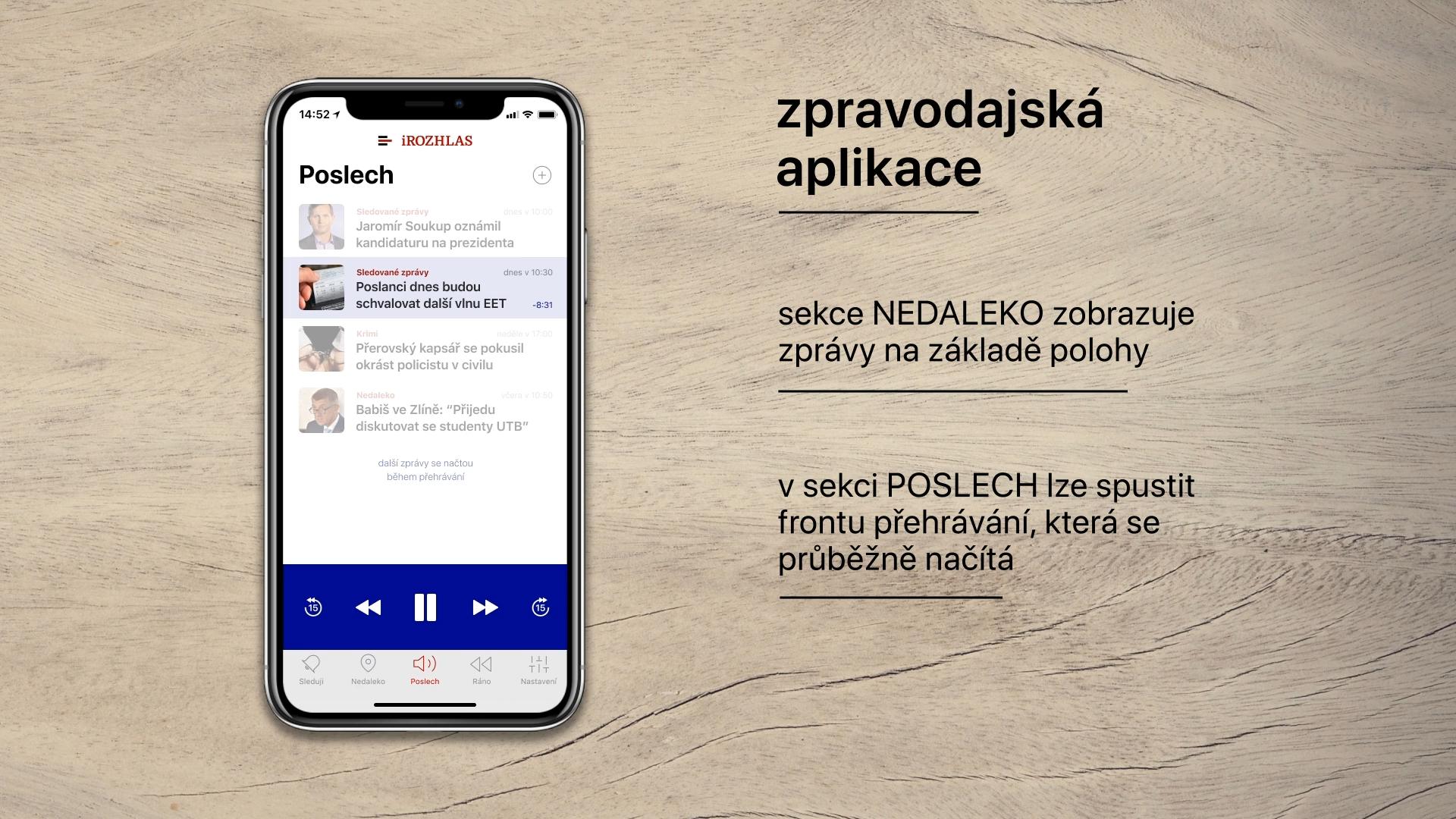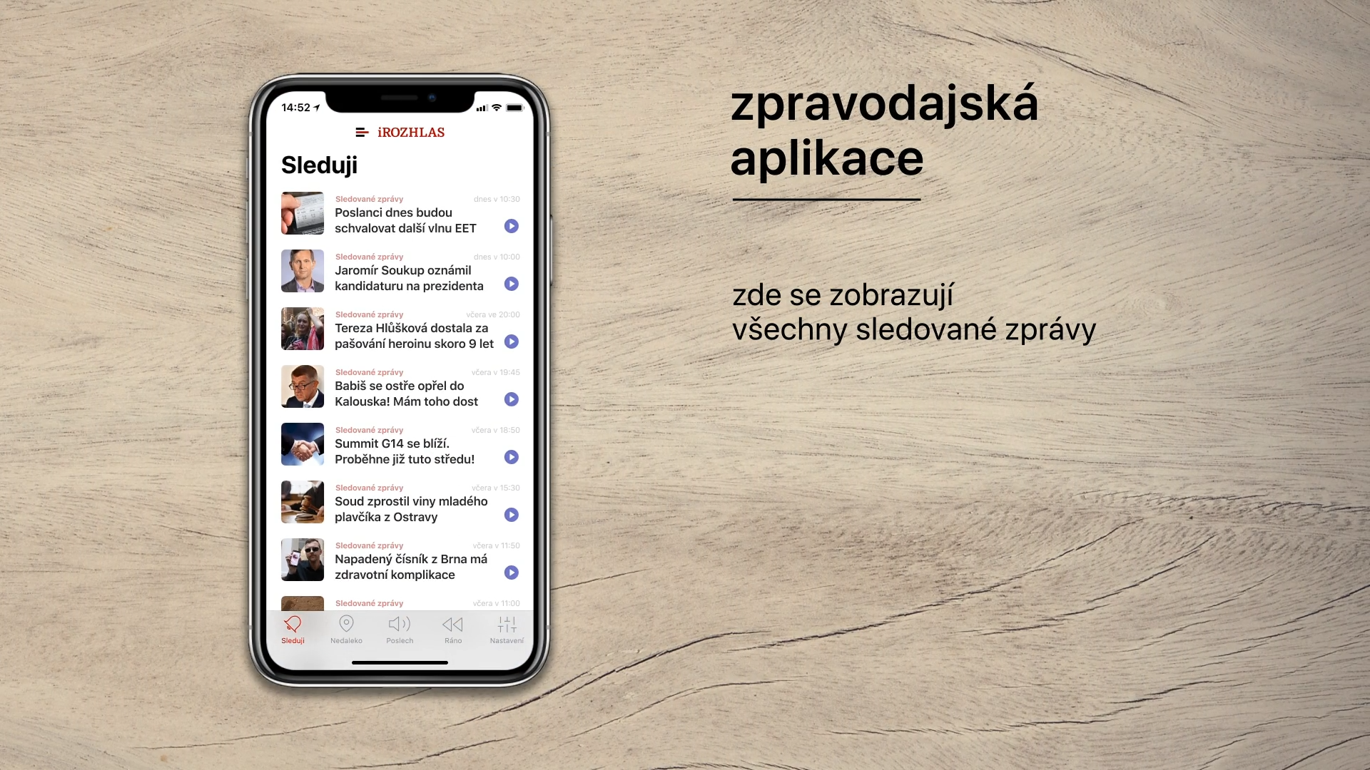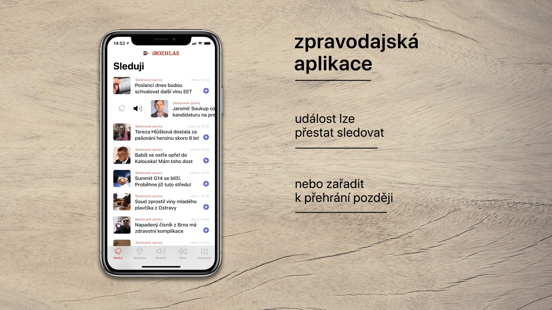 Jak dostat zpravodajství mezi denní rituály uživatele? V konceptu pro Český rozhlas a jejich zpravodajský server iRozhlas.cz pracuji s funkcí budíku, který ráno stáhne krátké audio zprávy, jež uživatele mohou zajímat (na základě personalizace) a následně je ve stanovený čas přehraje spolu se znělkou a uvítáním do nového dne. Součástí může být i předpověď počasí a zpráva o dopravní situaci (obojí na základě polohy zařízení). K uživateli se tak dostane pouze ten obsah, který jej skutečně zajímá (sledování dlouhodobých událostí a kauz), navíc je ranní vstávání hned zajímavější. Kromě událostí, které se staly, lze uživatele i upozornit na to, co bude probíhat během dne (plánovaná jednání, volby, kulturní a jiné akce). Budík je funkcí zpravodajské aplikace, která slouží ke čtení a poslechu zpráv během dne.
