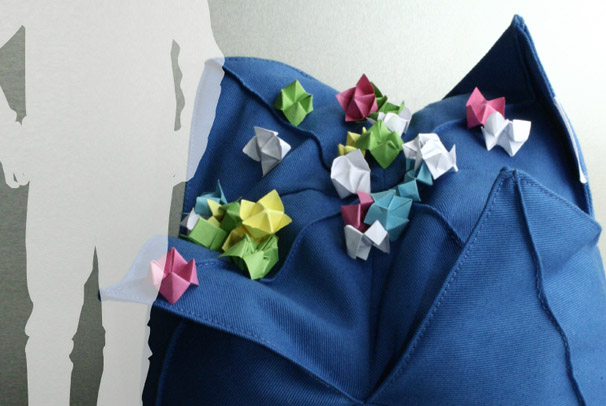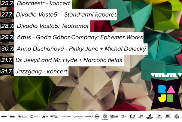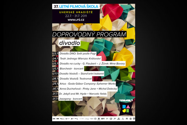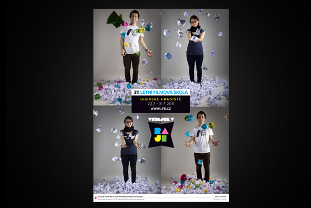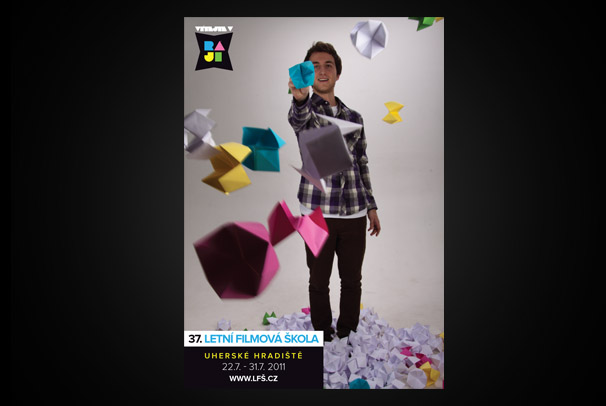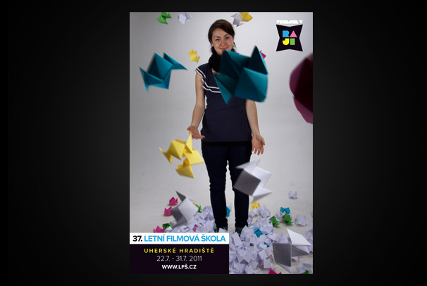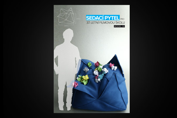 Při úkolu jsem se nechala inspirovat dětskou papírovou skládankou ,,NEBE-PEKLO-RÁJ“. Ta dobře posloužila jednak mé představě hravosti a barevnosti celého konceptu, a stejně tak vhodně podporuje i heslo festivalu ,,Vítejte v ráji“. Ke zpracování úkolu jsem chtěla přistoupit jinou cestou, než jak tomu bylo u minulých ročníků. K tomu mi posloužily fotografie mladých lidí, obsypaných barevnými i bílými skládankami. Tento námět by měl spolehlivě zasáhnout cílovou skupinu návštěvníků - mladé lidi, kteří tuto skládanku z dětství dobře znají. Papírová skládanka slouží jako 3D objekt a splňuje onu hravost. V předtištěných verzích jsou názvy jednotlivých promítacích míst, takže když se návštěvník nemůže rozhodnout na jaký film zajít, může se zeptat skládanky. Prázdné skládanky si návštěvníci mohou sami vypisovat a tím se navzájem bavit. Zároveň skládanka obsahuje vždy program na daný den či jiné doprovodné texty. Druhý 3D materiál je sedací vak, který jistě potěší unavené návštěvníky svým pohodlím. Sedací pytel je stylizací papírové skládanky.