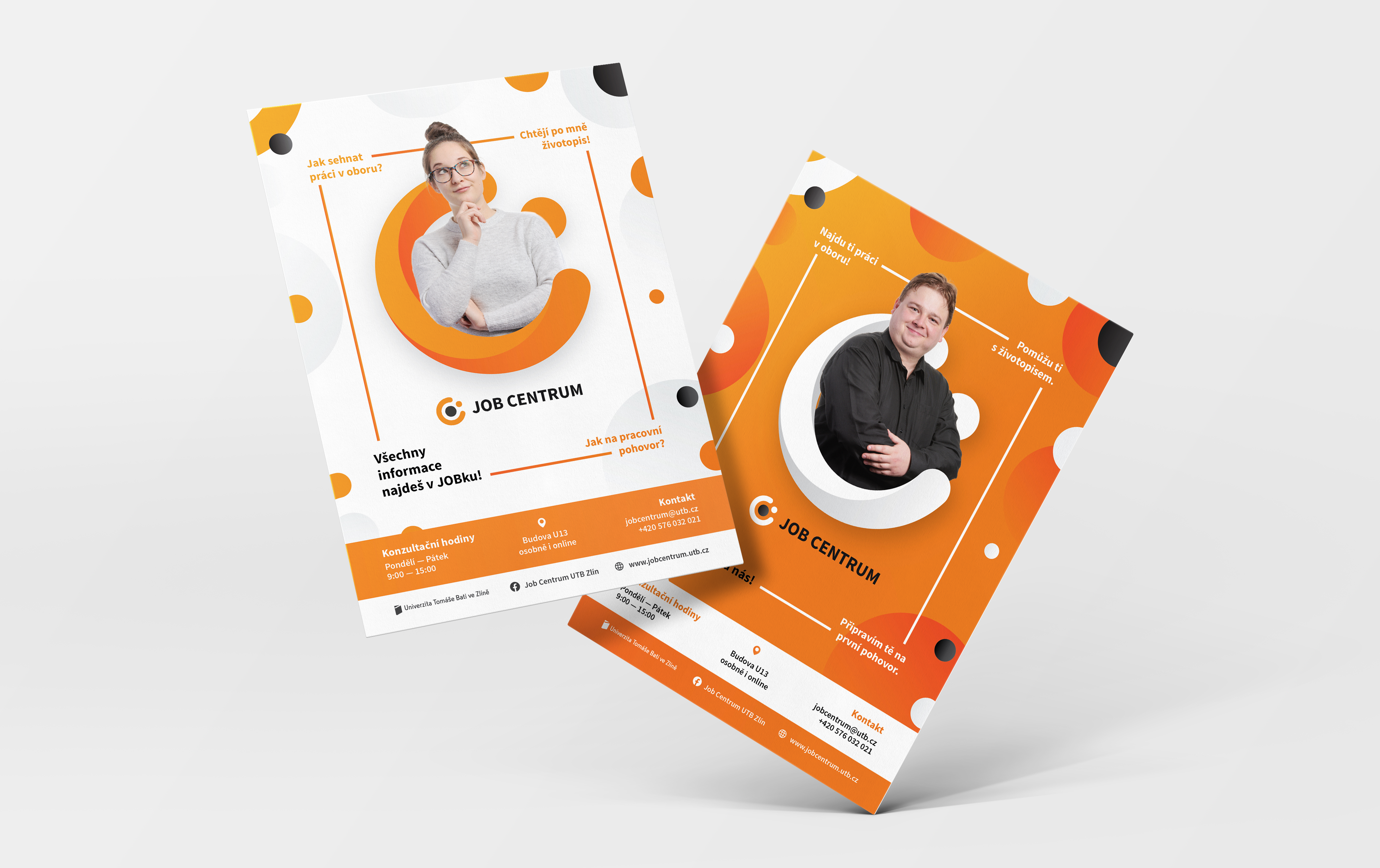 Nová vizuální identita Job Centra UTB je postavená na moderním a jednoduchém vzhledu s hlavní oranžovou barvou univerzity. Nejvíce důležitá věc je nové logo, které mírně vychází ze starého, kde můžeme vidět šipky značící koloběh. V logu je také schované písmeno J, v negativním prostoru písmeno C a uprostřed najdeme terč do černého. Logo funguje dále jako zapamatovatelný symbol pro okolí, které časem začne být spojováno se samotným Job Centrem UTB. K celé vizuální identitě byl i vytvořen web a portal pro studenty, kde si mohou najít práci, stáž a nebo brigádu.