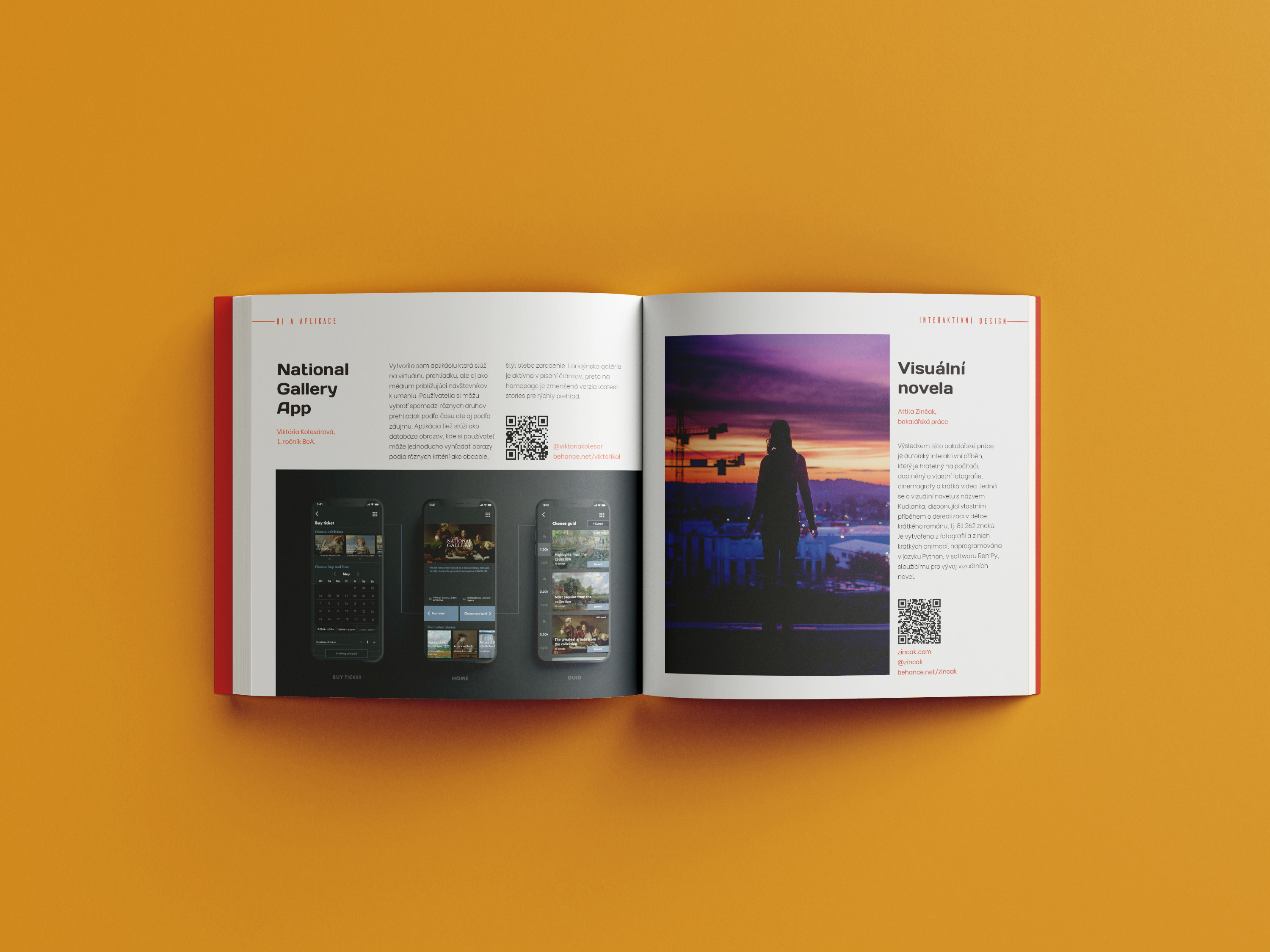ADD tvoří rozličné projekty s rozličnými výstupy a tomuto faktu je třeba přizpůsobit rozvržení katalogu, který tyto práce promuje. Jednoduchá trojsloupcová sazba umožňuje dodržovat přehledné zrcadlo sazby a zároveň pracovat s různými rozměry výstupů, náhledů a fotografií, které studenti nahrávají a posílají k dalšímu použití při propagaci ateliéru. V záhlaví rovněž najde čtenář vždy zaměření projektu, tedy jestli se jedná o aplikaci a UI design, typografii, nebo vizuální styl, pod projektem pak QR kód, který jej odkáže na stránku projektu na webu digitalnidesign.cz. Práce je také doplněna o odkazy na autorovy stránky, služby typu Behance a Dribble, nebo instagramový nick, díky čemuž si může čtenář pohodlně prohlédnout další práce konkrétního tvůrce.