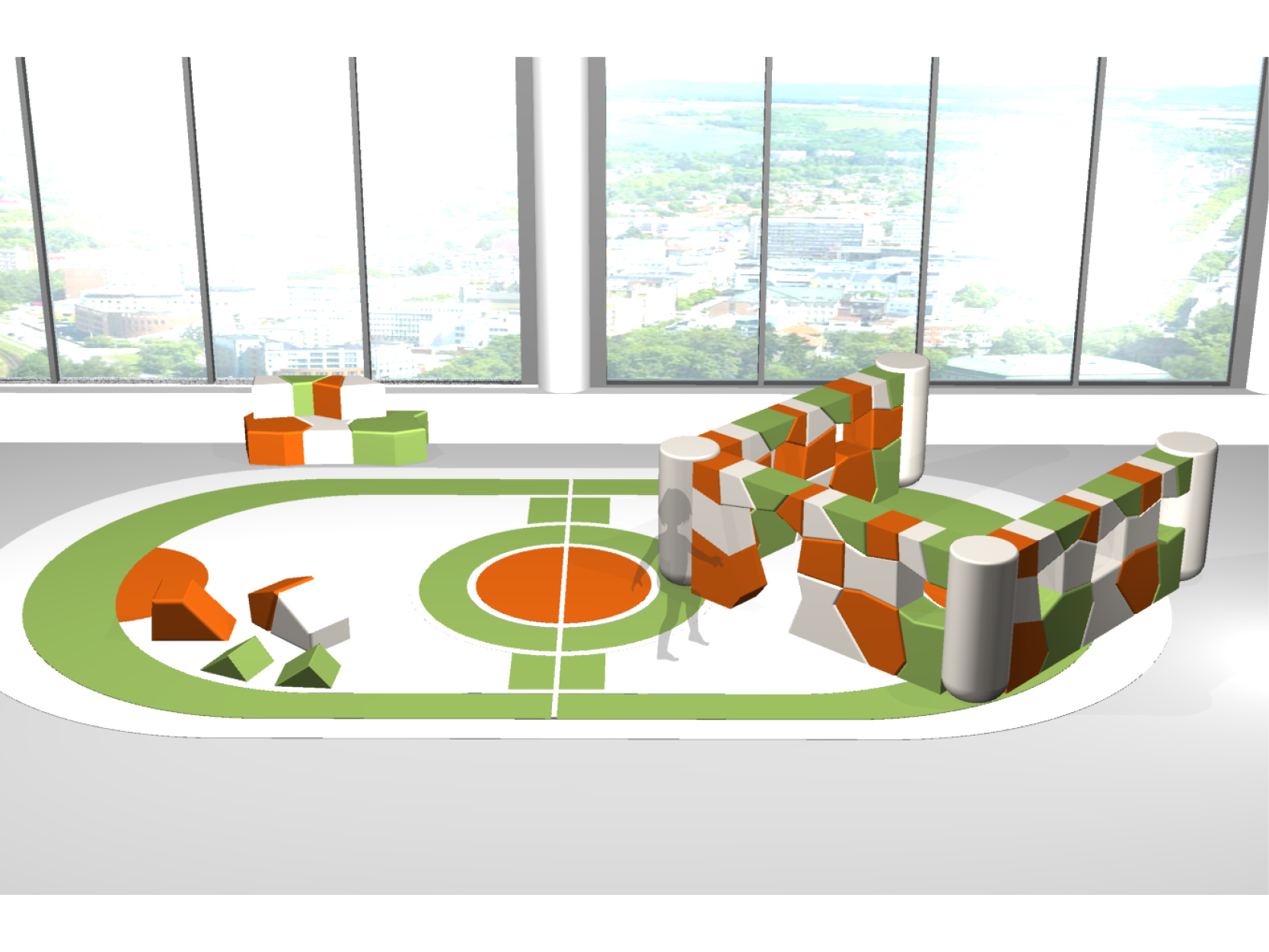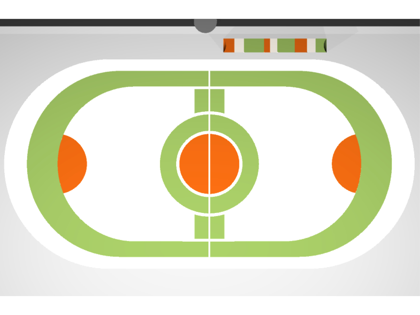 Hrací pole obsahuje: okruh pro koloběžky; branky pro fotbal, florbal; rozdělení na dvě hřiště = 4 branky; skákací panák v prostředním sloupci.