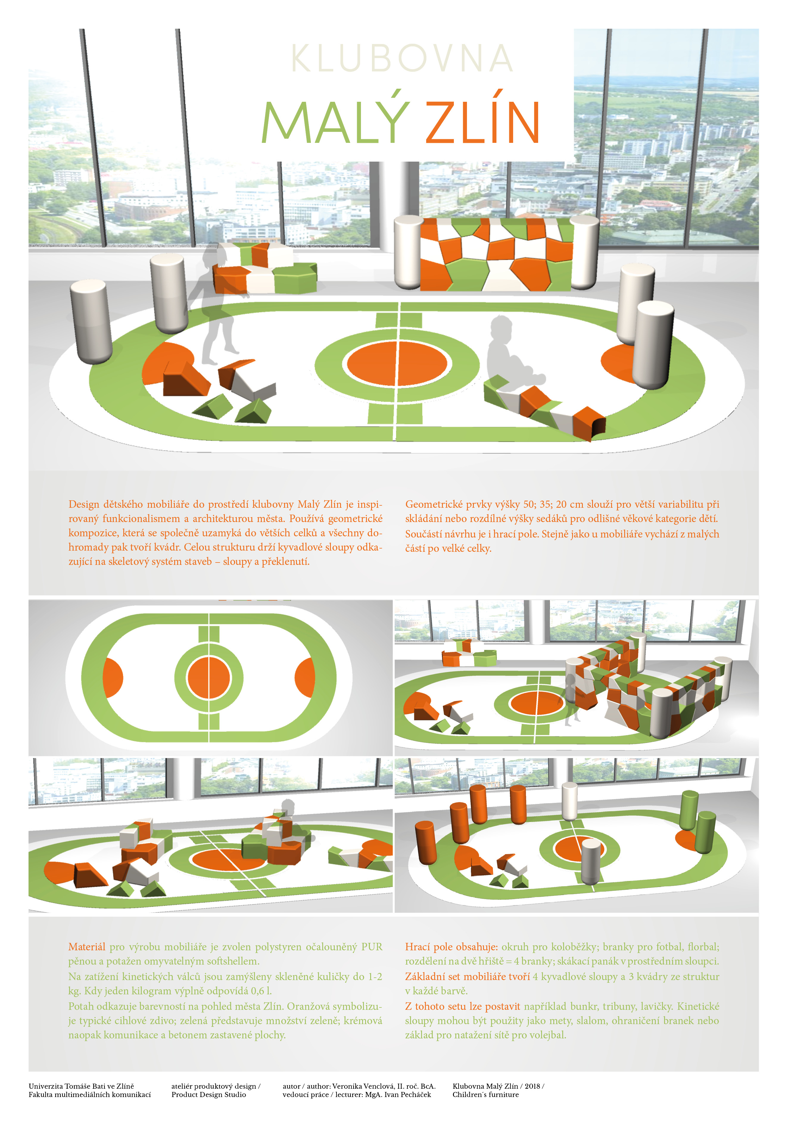 Design dětského mobiliáře do prostředí klubovny Malý Zlín je inspirovaný funkcionalismem a architekturou města. Používá geometrické kompozice, která se společně uzamyká do větších celků a všechny dohromady pak tvoří kvádr. Celou strukturu drží kyvadlové sloupy odkazující na skeletový systém staveb – sloupy a překlenutí.