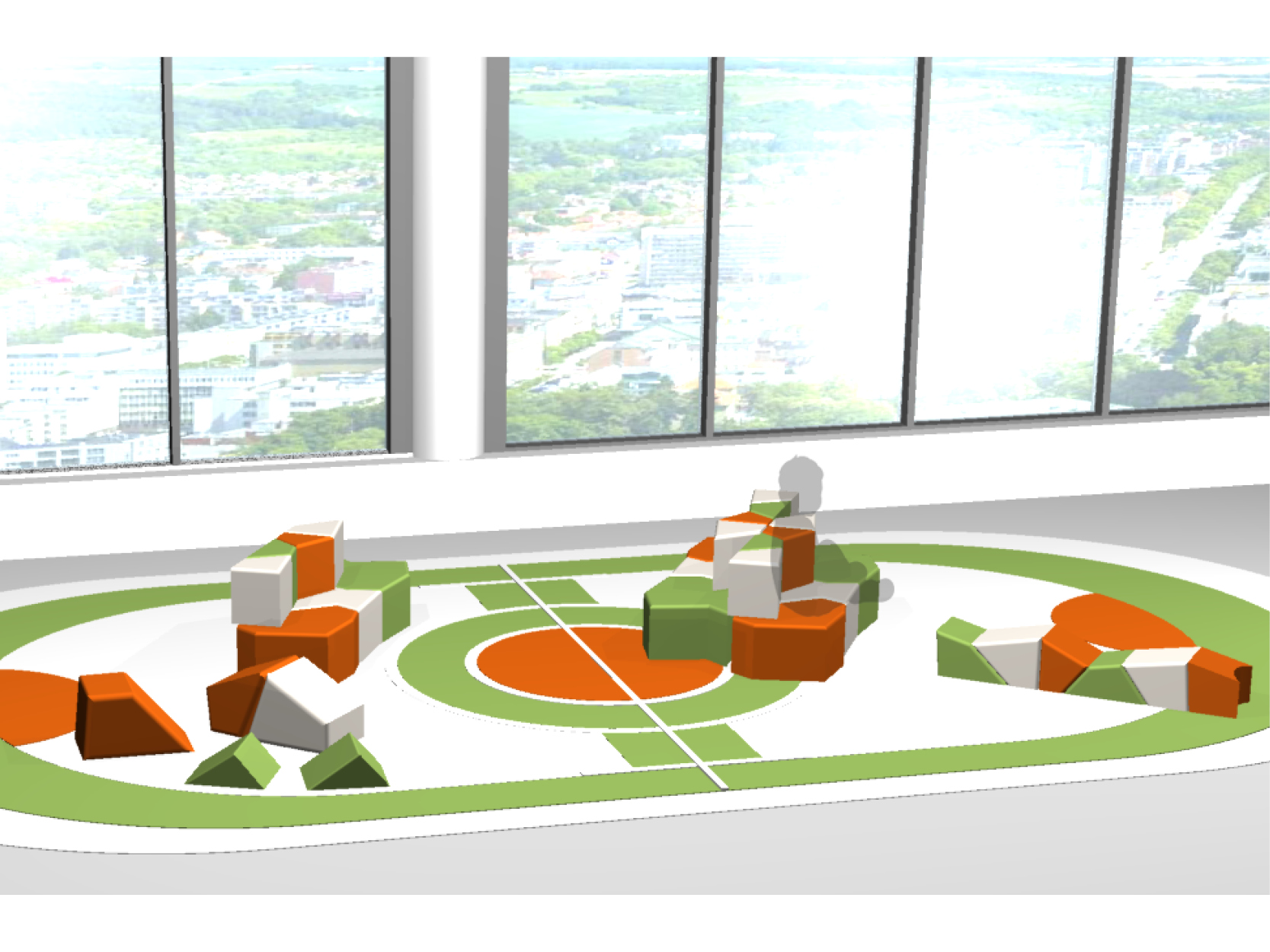 Základní set mobiliáře tvoří 4 kyvadlové sloupy a 3 kvádry ze struktur v každé barvě.