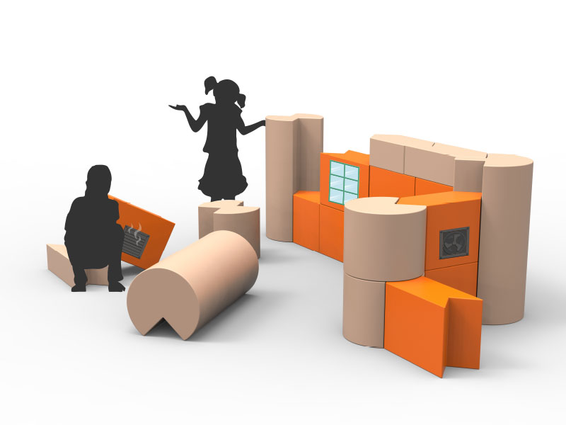 Nábytek do dětského koutku je inspirován kostkami pro děti, které nejsou ničím spojovány a skládají se na sebe. Děti si tak můžou užít hru se stavebními prvky bez omezení pravidly, které se u spojů musí dodržovat. Při skládání tak rozvíjí svoji motoriku a také fantazii. Samotné prvky pak jsou inspirovány zlínskou architekturou. Barvné řešení je taktéž inspirováno zlínskou architekturou - základ tvoří prvky cihlové barvy a prvky inspirované překlady a sloupy jsou v bavě béžové. Prvky jsou dopněny o návrh potisku. Jsou to okna, klimatizace, ventilace, potrubí, atp., které najdeme na zlínských budovách. Základní sada je tvořena 6 různými půdorysy a 3 různými výškami dílů. Půdorys je tvořen tak, aby do sebe zapadaly a navazovaly na sebe, ale neomezovaly děti v možnostech skládání. Celá stavebnice se dá využít také jako sedací prvky.