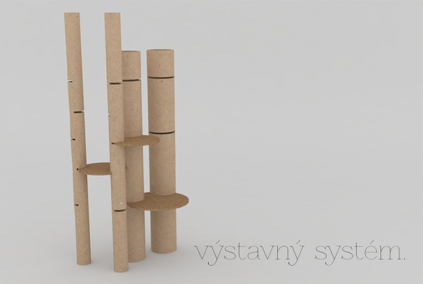 Výstavný systém bol navrhovaný z odpadových materiálov, papierových trubíc a kartónov. Vzájomným prerezávaním trubíc a zasúvaním kartónových kruhov vznikne mnoho originálnych , jedinečných výstavných stojanov.