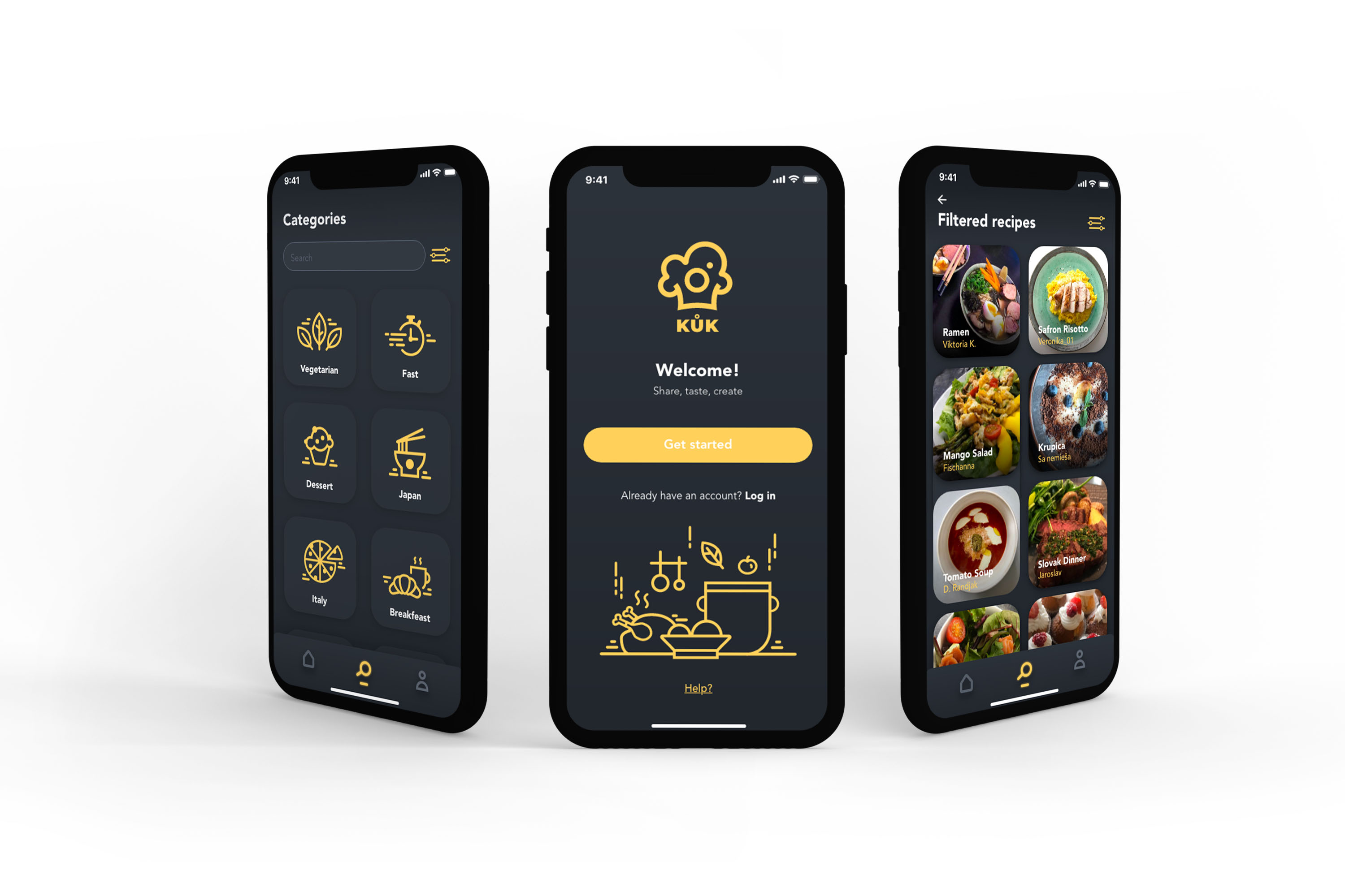 Ako aplikáciu som chcela vytvoriť niečo čo by fanúšikom jedla uľahčilo varenie. Po preskúmaní trhu a práve dostupných možností som zistila, že neexsituje appka, ktorá by dizajnovo funkčná a zahrňovala všetky funkcie. Tieto chyby som vyriešila v aplikáciií KŮK. KŮK spája sociálne siete s receptárom. V aplikácií môže si môže uživateľ vytvoriť svoj vlastný účet a zdielať recepty s celým svetom. Jednoduchý prehľadný interface som dotvorila farebnými ilustráciami, ktoré doplňujú fotky jedla. Taktiež má uživateľ možnosť hodnotiť, sledovať alebo hľadať recepty podľa toho čo má práve v chladničke.