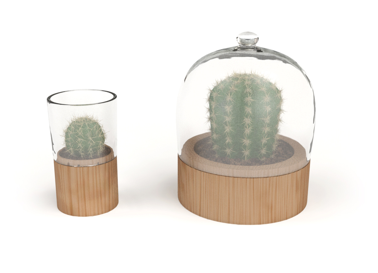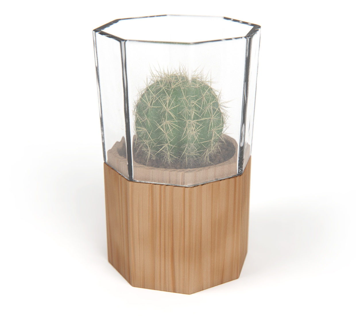 Drobný květináč na kaktus,který lze umístit na pracovní stůl nebo jím okrášlit hluchá místa. Vyroben z ořešáku ošetřeného lněným olejem a skleněnou clonou.