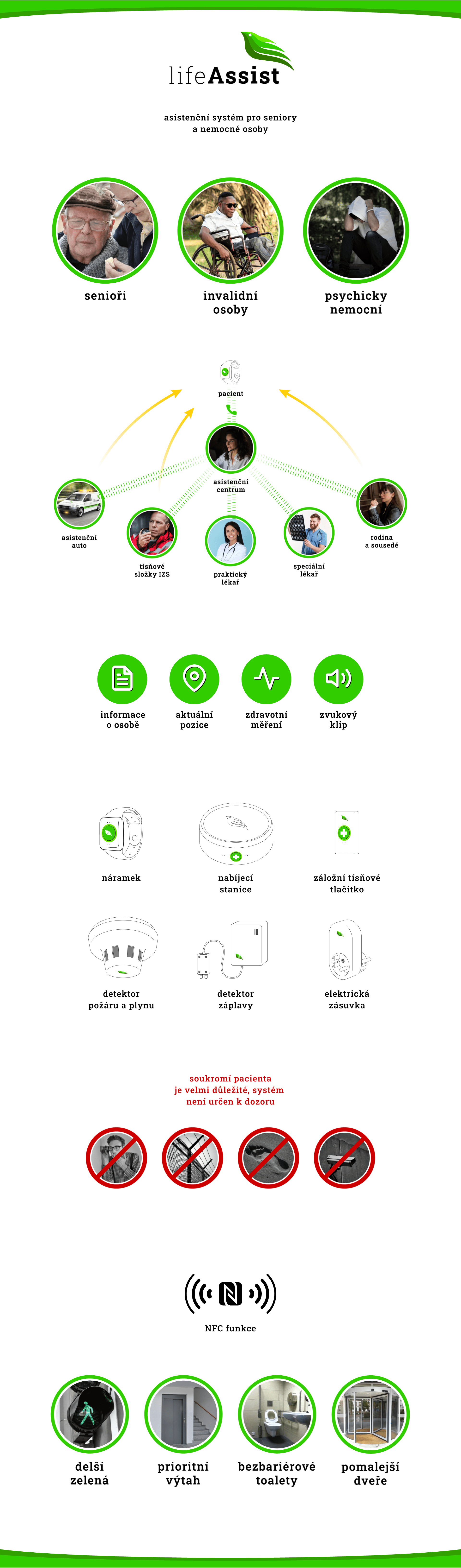 Koncept v rámci zadání LongLife, jehož cílem je chránit životy seniorů a nemocných lidí, kteří žijí samostatně mimo zdravotnická zařízení. Projekt nastiňuje asistenční systém, postavený na komunikaci mezi pacientem a asistenčním centrem. Každý pacient má svůj náramek, který jej hlasovým hovorem propojí s operátorem v centru. Operátor má k dispozici řadu prostředků, kterými poskytne pacientovi pomoc. Kromě náramku jsem navrhl i přídavné prvky do domácnosti, které mohou detekovat a zmírnit nebezpečnou situaci.