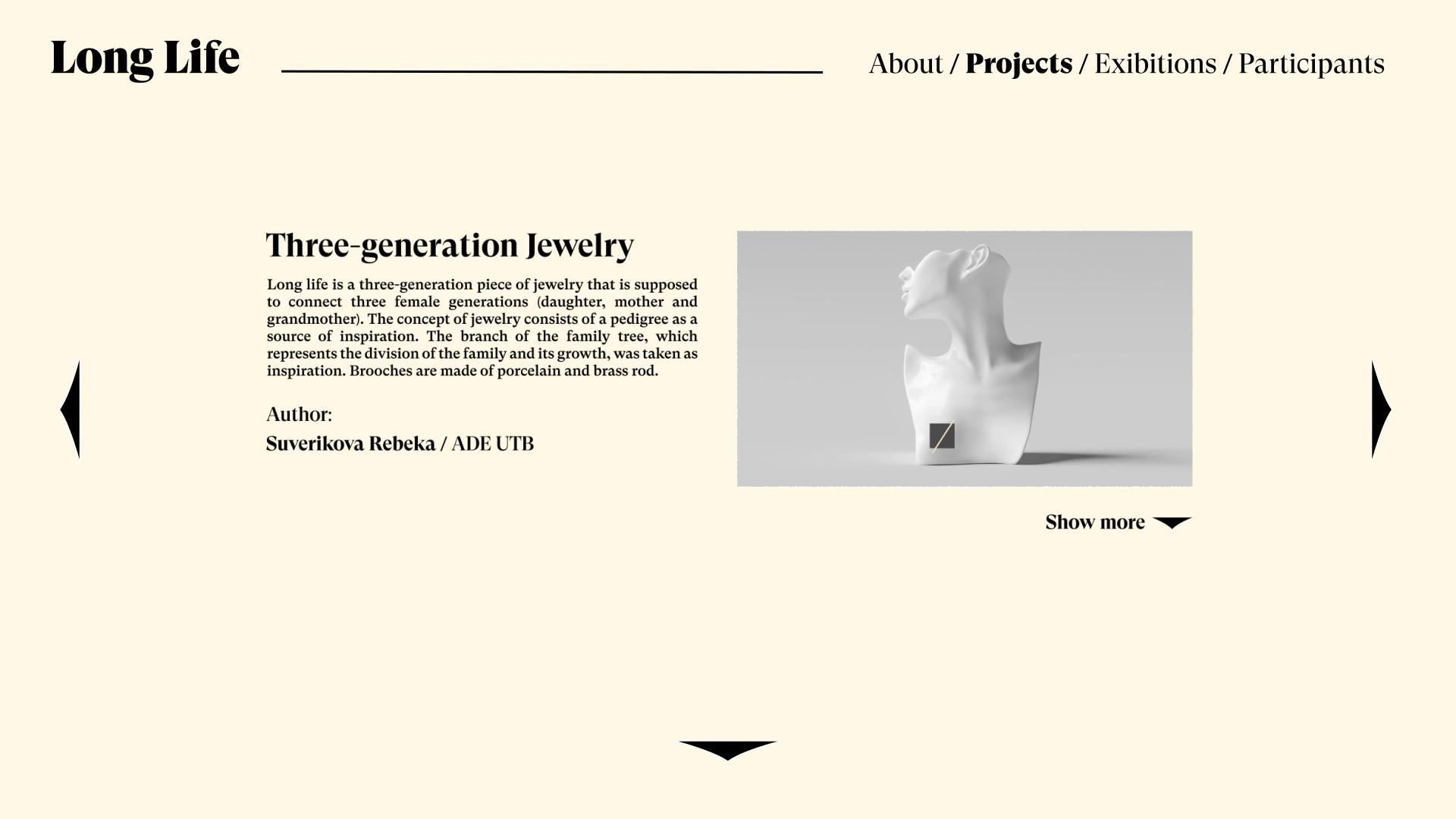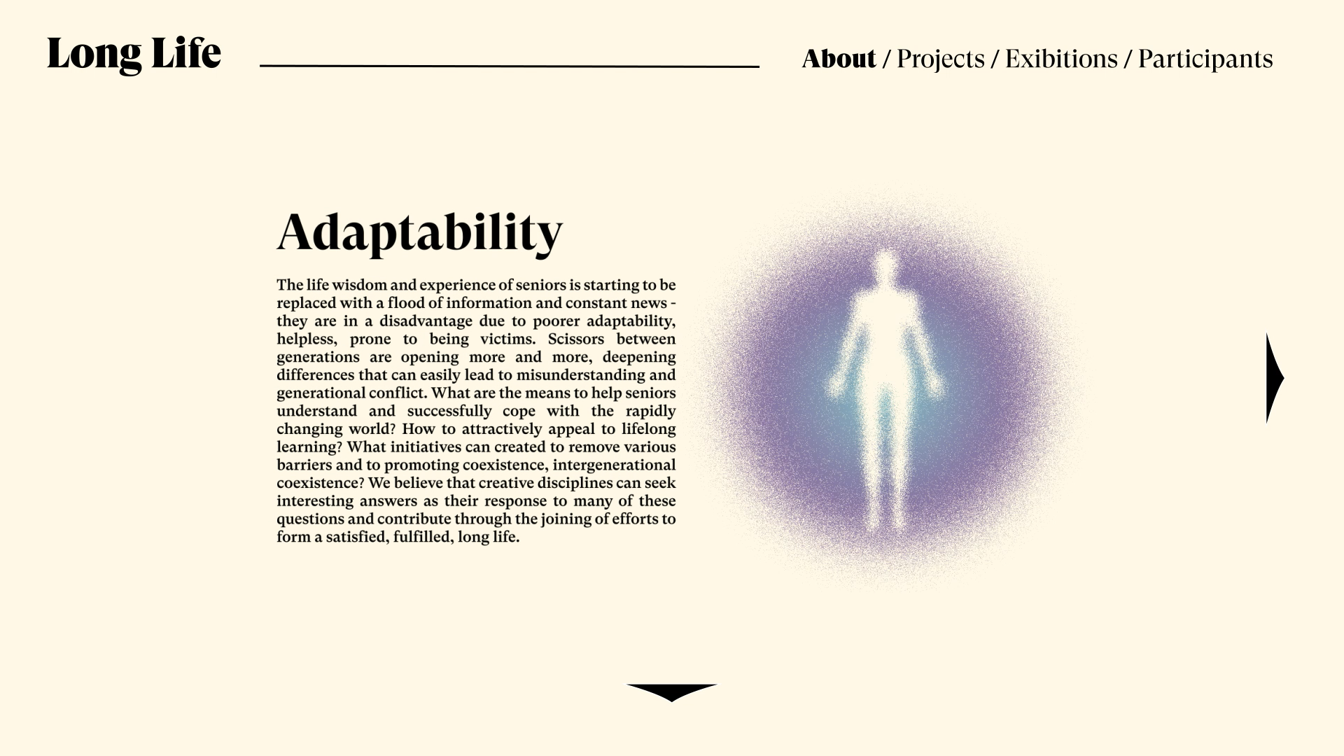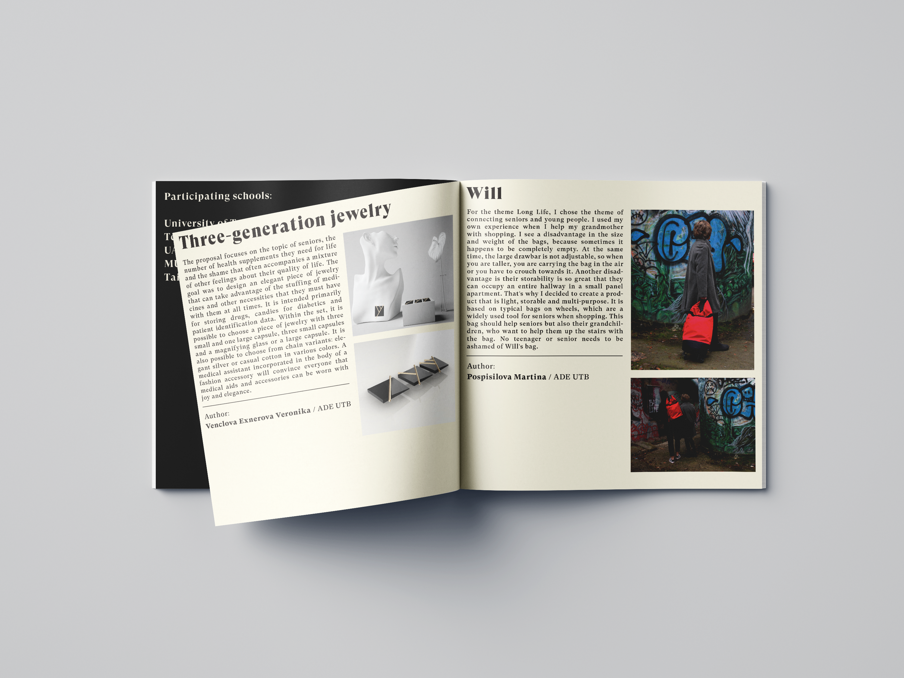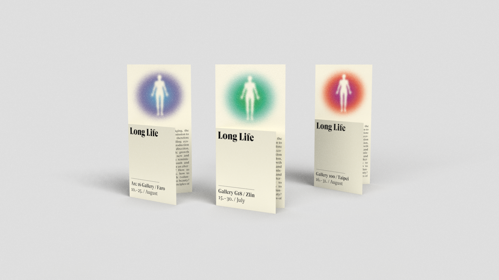 Ve vizuální identitě projektu Long Life jsem pracoval se siluetou člověka jako symbolem života, který je zasazen do barevných gradientů symbolizujících jednotlivá odvětví samotné myšlenky projektu (zdraví, soběstačnost a adaptabilita). Použil jsem moderní serifový font, abych zachoval důstojnost myšlenky projektu a zároveň zdůraznil jeho inovativní potenciál. Webové stránky projektu jsem se snažil zachovat co nejvíce intuitivní a přehledné, aby byly lehce dostupné napříč generacím. Se stejnou myšlenkou jsem postupoval i při tvorbě propagačních materiálů a návrhu katalogu.