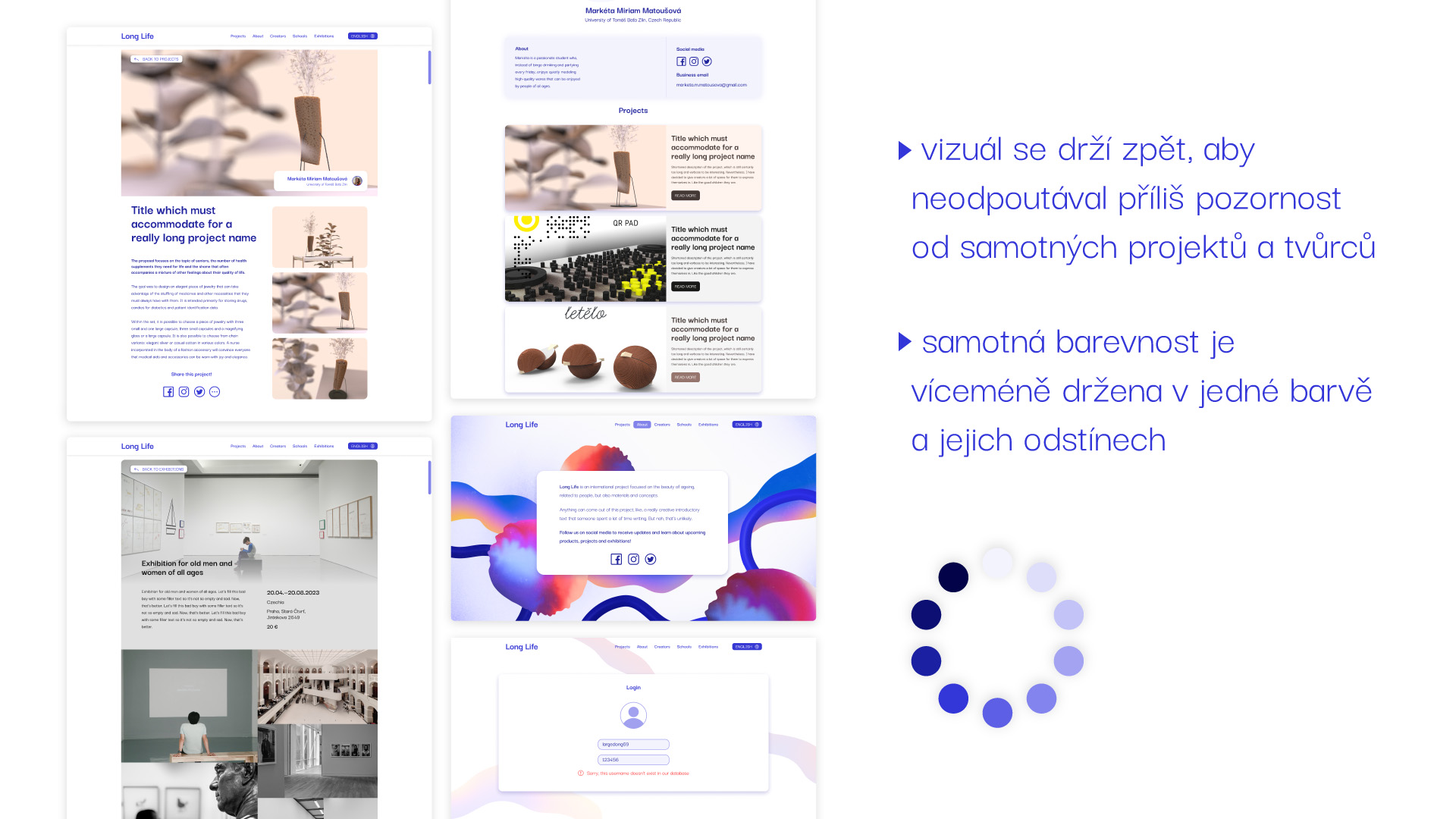 Barevnost webu je omezena ve prospěch samotných studentských projektů, které budou lépe vynikat svou vlastní barevností.