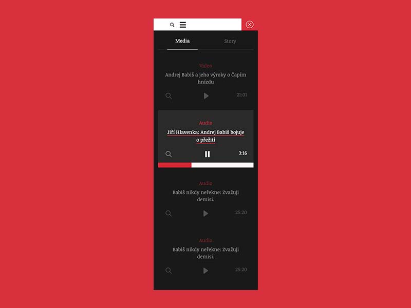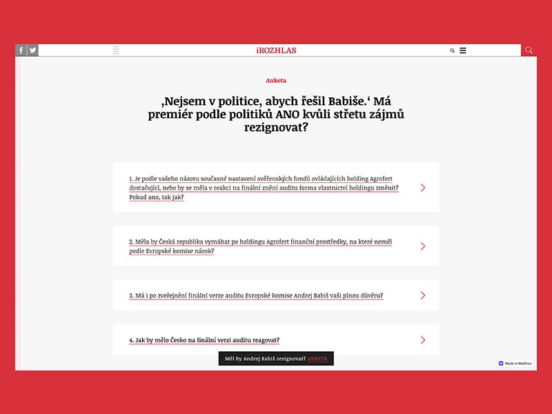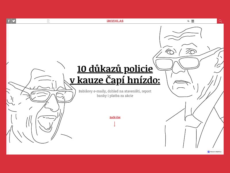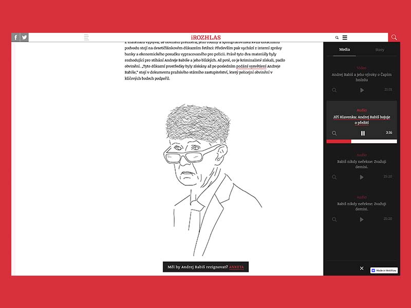 Celkový koncept je navržen tak, aby vhodně zapadl do současného vizuálního stylu Českého rozhlasu. „Příběh longreadu“ podporují animace spouštěné na základě posunovaní se stránkou. Longread má k dispozici postranní výsuvný panel obsahující náhled veškerých médií, které daná stránka / longread obsahuje. Uživatel si tak může snadně zobrazit jen mezi audio / video / anketa / a nebo se svižně pohybovat v rámci obsahu celého longreadu a vyhledat si pouze požadované informace či se naopak rychle vrátit tam, kam potřebuje. Během čtení (nastaveno na 35 % přečteného obsahu) se automaticky zobrazuje pop-up okno s upozorněním na anketu, jež se vztahuje k danému tématu / longreadu. Stránku jsem vytvořil v nástroji Webflow– reálně funguje na webové adrese https://irozhlas.webflow.io/ (prozatím optimalizováno pouze pro 15' display a iPhone X, XS).