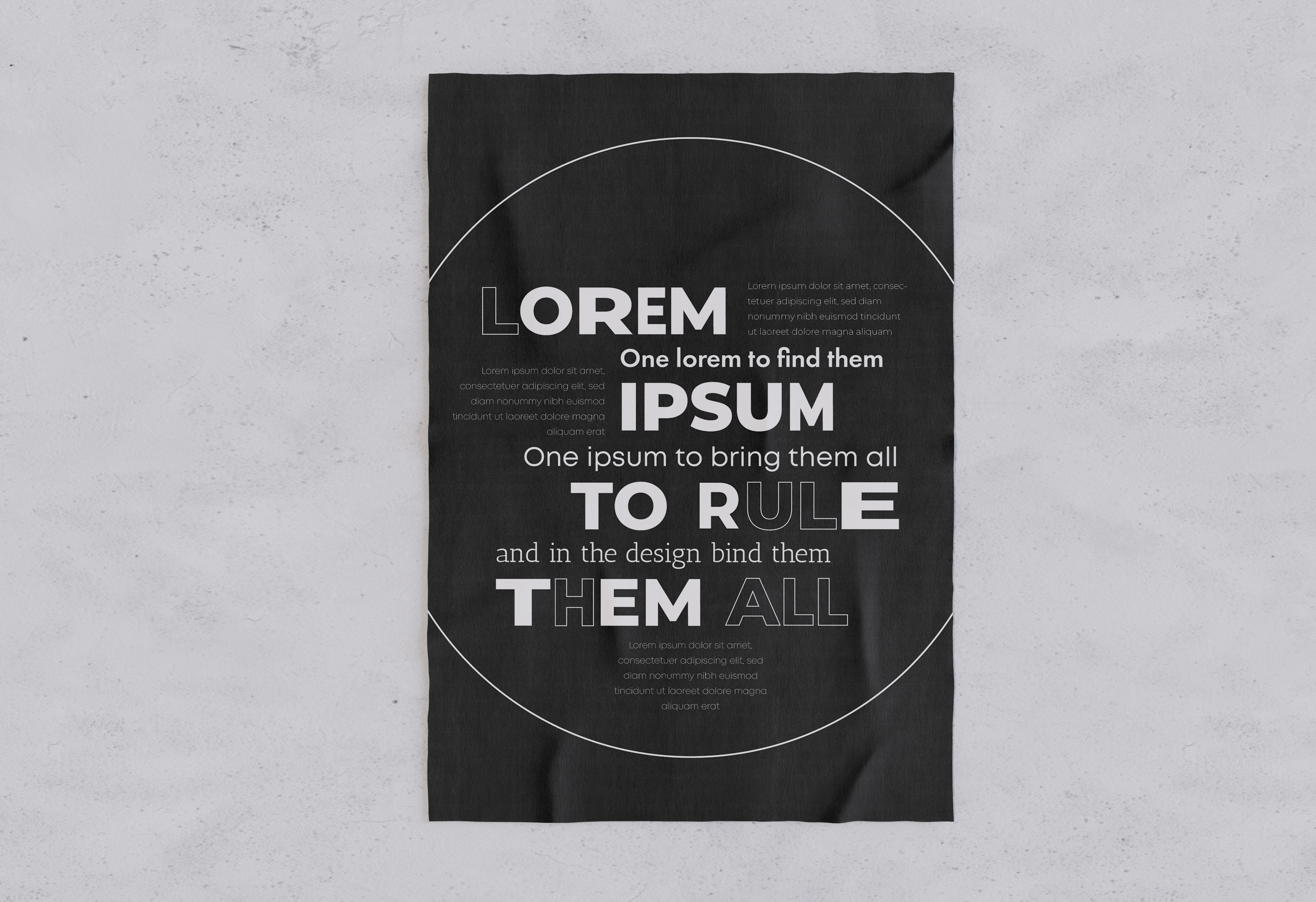 Plagát s kombináciou štyroch fontov poukazuje na prílišné používanie textu lorem ipsum a jeho prítomnosť v takmer všetkých odvetviach desingu.