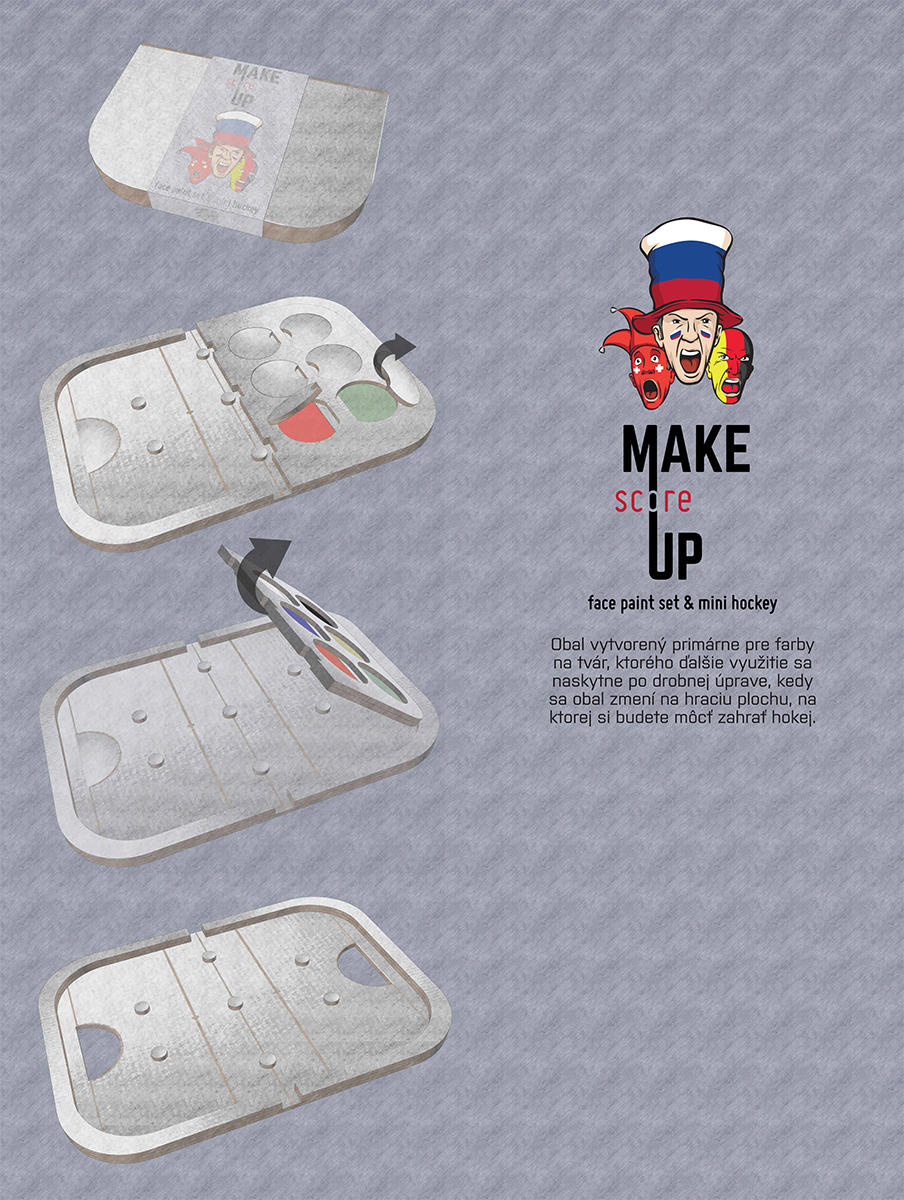 Obal vytvorený primárne pre farby na tvár, ktorého ďalšie využitie sa naskytne po drobnej úprave, kedy sa obal zmení na hraciu plochu, na ktorej si budete môcť zahrať “mini” hokej.