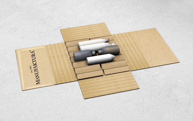 Návrh kartonového obalu na přírodní kosmetiku od české značky Manufaktura. Hlavní část obalu je tvaru kříže. Zbytky kartonu jsou využity jako vyplň, aby nevznikal zbytečný odpad. Boční stěny mají narýhované části, aby se lépe přizpůsobily balenému zboží. Když je krabice prázdnější, stěny lze více zmačknout a tím se zamezí pohybu zboží. Naopak při plné zásilce se stěny narovnají na maximální rozměr.