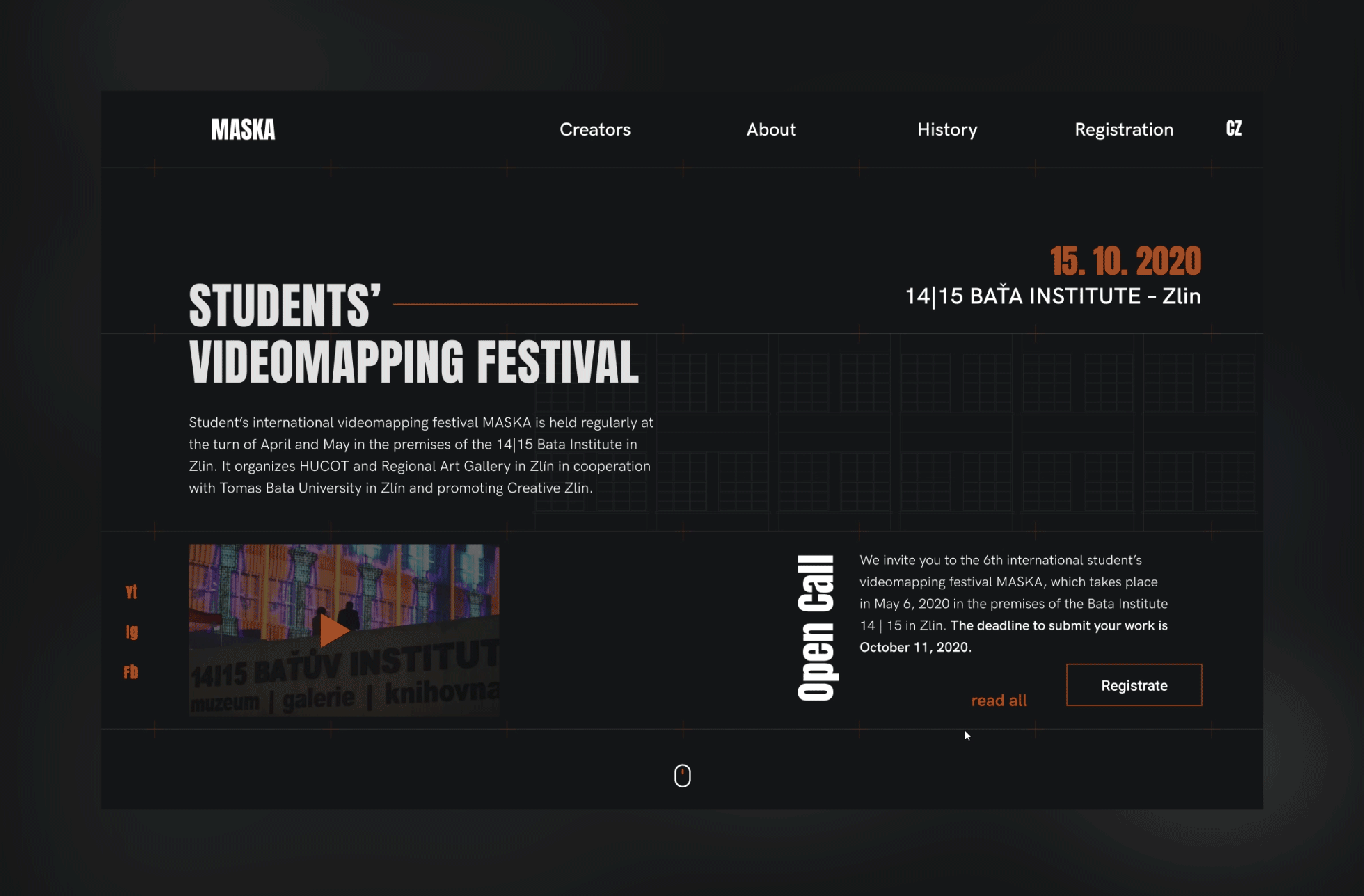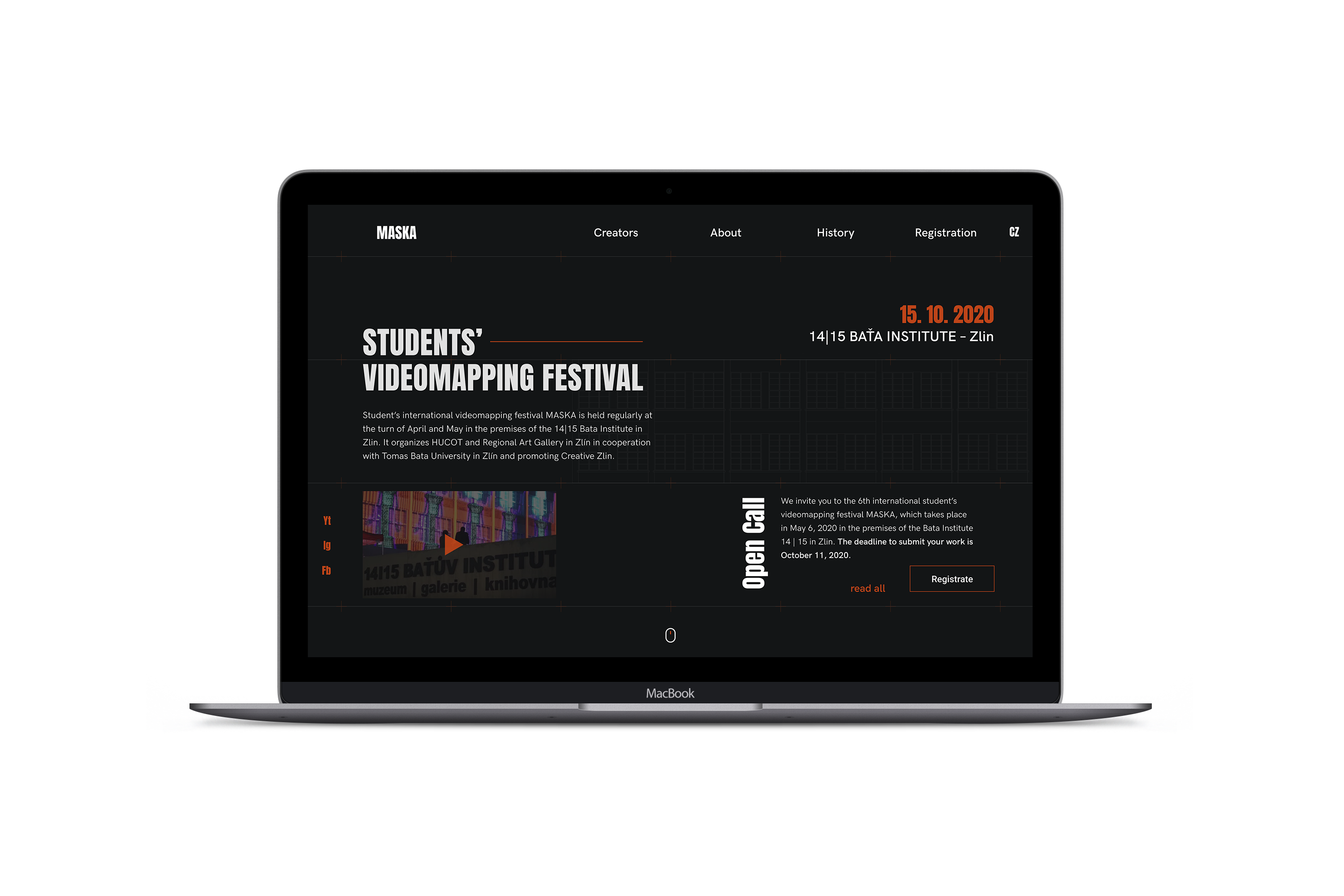 Návrh nového vebu mappingového festivalu som ladil do tmavých farieb v kombinácii so sýtou oranžovou, ktorá má poukazovať na zázemie festivalu a tehlovú fasádu Zlína a Baťovho inštitútu. Web je delený pomocou horizontálnych čiar a oranžových krížikov, ktoré odkazujú na pôvodný, horizontálne natiahnutý mapping. Web má byť jednoduchý, s použitím jemnej grafiky masky 15. budovy.