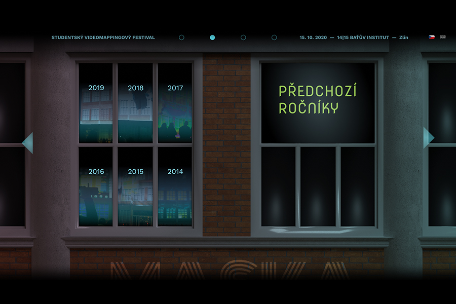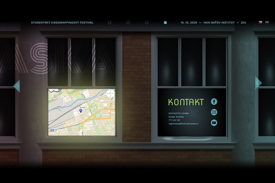 Rozhraní webu pro studentský videomappingový festival Maska je inspirované samotnou akcí. Protože jsou pro ni zásadní budovy Baťova institutu, staly se výchozím motivem celého prostředí. Jednotlivé architektonické prvky určují layout, do kterého je zasazen obsah. Web se skládá ze čtyř hlavních stránek, přes které se dostaneme například k registračnímu formuláři, galerii předchozích ročníků nebo dalšímu obsahu.