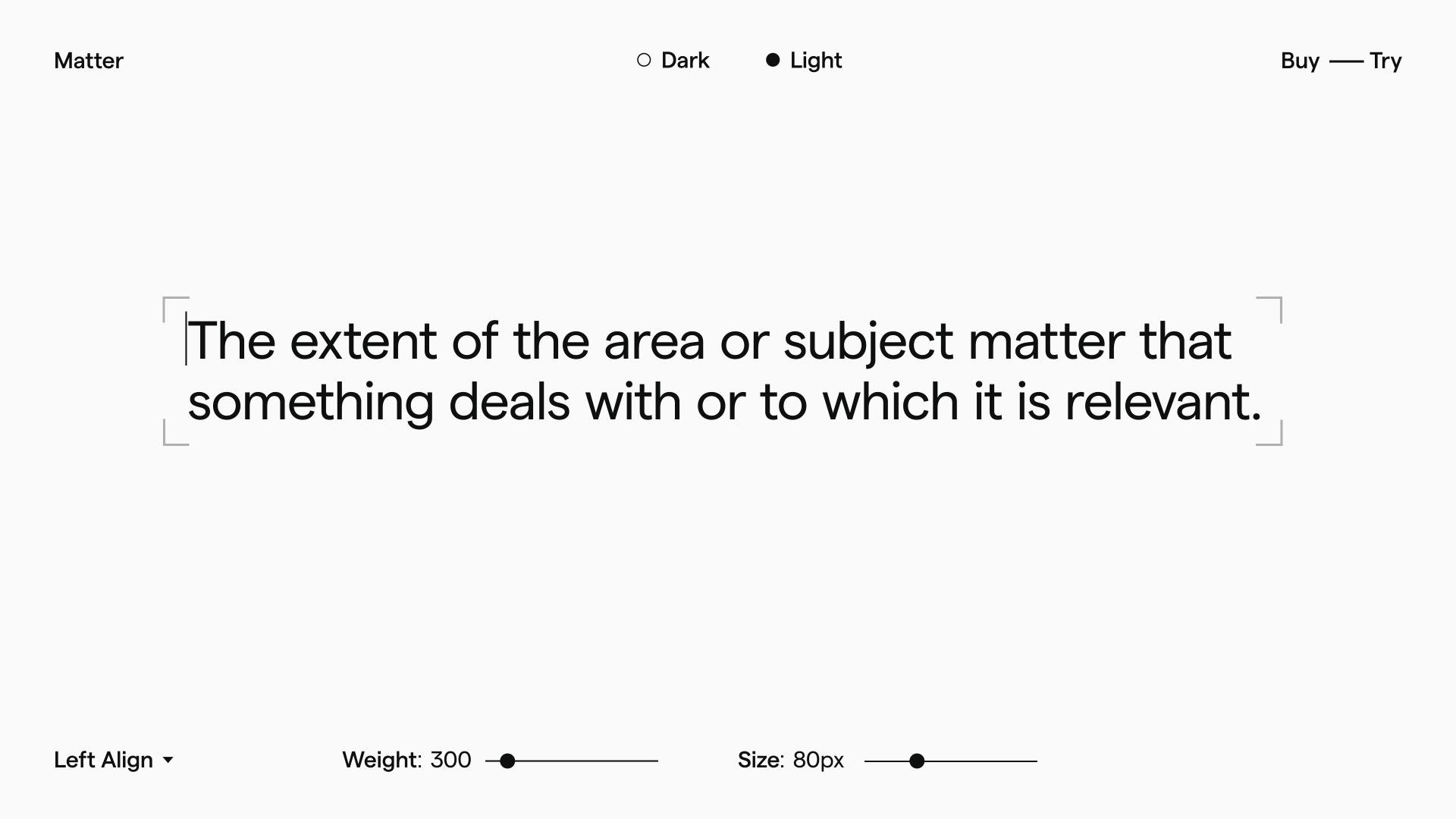 Prezentačná microsite písma s príznačným názvom Matter, ktoré vzniklo v Prahe. Web je zložený z niekoľkých častí a animácii, pričom niektoré priamo alebo skryto narážajú na Prahu či Česko. Vizuál webu nemá za potrebu byť extravagantný a preto je vytvorený v elegantnej v tmavej a inverznej verzii. Microsite v niekoľkých častiach postupne vyzdvihuje jeho silné stránky ako napr. dobrá čítateľnosť ako v nadpisoch tak i v paragrafe, podpora širokej škály diakritiky… Záver je venovaný interaktivite užívateľa pomocou „typetestera“ – napísanie si vlastného textu.