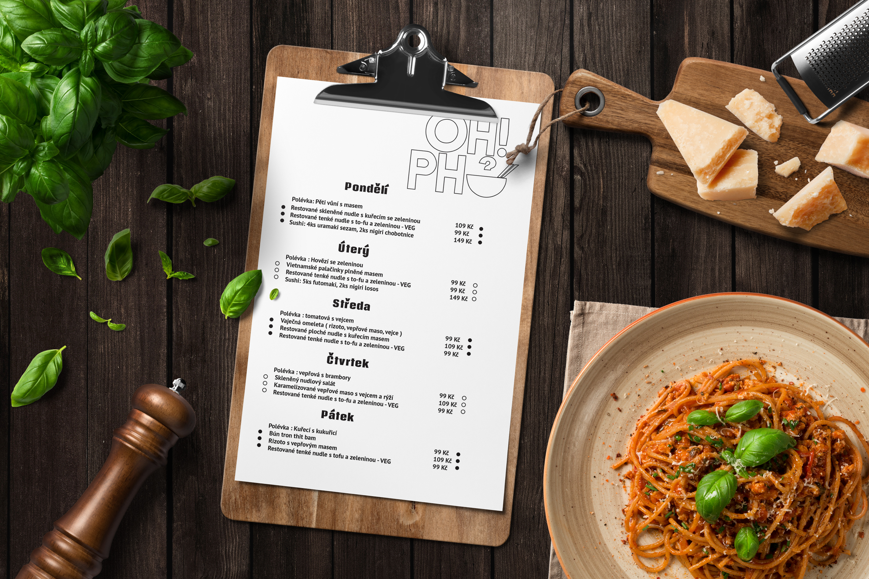 Jídelní lístek s týdenní nabídkou pro restauraci Oh Pho v Brně.