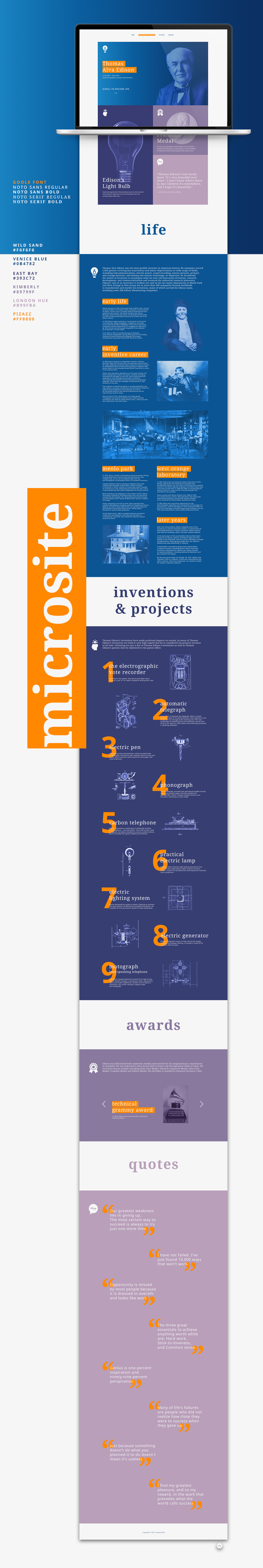 Klauzúrna práca - microsite o vynálezcovi a podnikateľovi Thomasovi Edisonovi. Moderný scrollovateľný web je rozdelený na štyri časti obsahujúce najdôležitejšie okamihy z jeho života, galériu vynálezov, získaných ocenení a výber citátov.