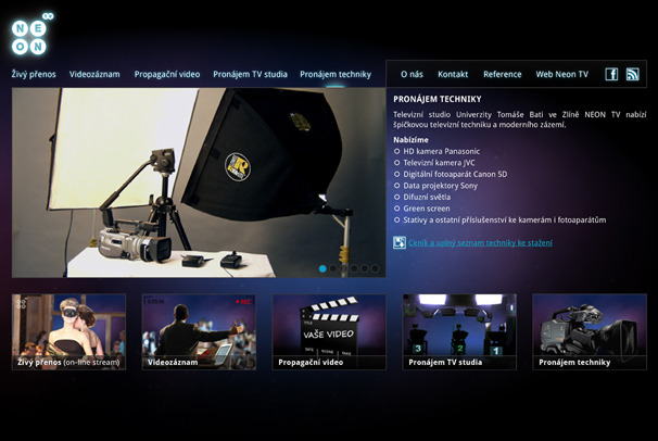 Microsite služeb nabízených televizním studiem Univerzity Tomáše Bati ve Zlíně NEON TV.