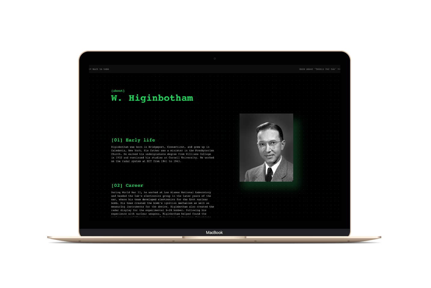 Cieľom bolo vytvoriť web pre výynamnú osobnosť. Ja som sa rozhodol vytvoriť web pre tvorcu prvej video hry. Web som sa snazil spraviť interaktívny a pútavý no na druhej strane velmi jednoduchý. Vizuál berie inspiráciu z programátorkých a technických nástrojov.