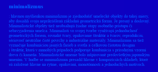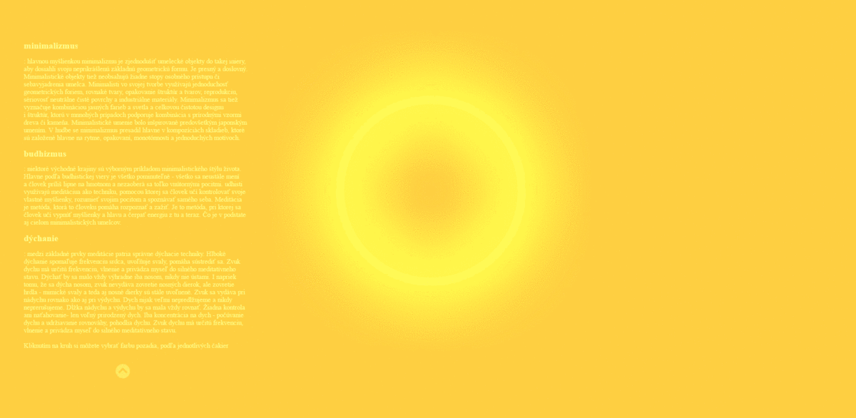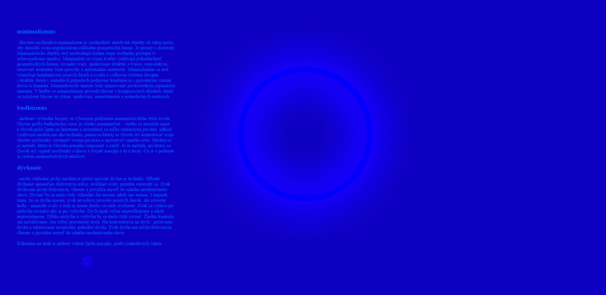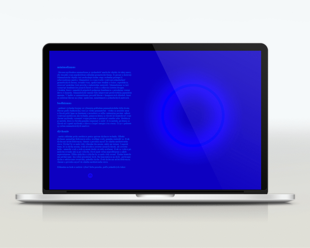 Digitálna reinterpretácia umeleckého štýlu- minimalizmu. Webová stránka s dominantným pluzujúcim kruhom ako pomôckou na správne dýchanie pri meditácii = využíva rytmus dychu. Jednoduchý web obsahuje výklad pojmu minimalizmus a jeho prepojenie s meditáciou a dýchaním /tieto informácie sa dajú minimalizovať, aby nerušili pri meditácii/. Farby čakier sa menia po kliknutí na kruh. Web je inšpirovaný americkým minimalistom Jamesom Turrellom.