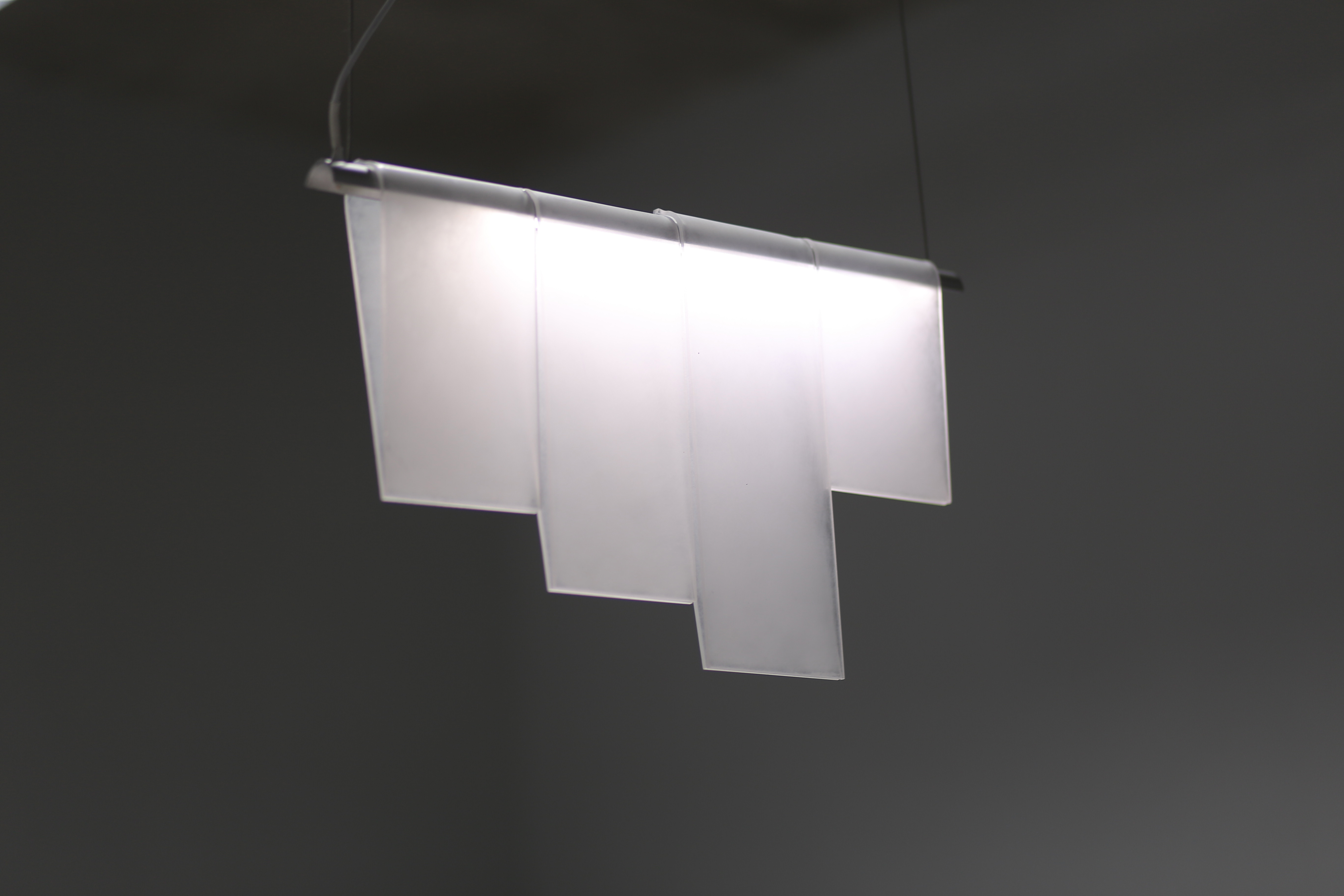 Světlo do interiéru. Světlo je tvořené hliníkovou půlkruhovou konstrukcí. Jako stínidlo jsou použité plexisklové pláty, ohnuté a ve spodní části spojené, tak aby schovaly a rozptýlily světelný zdroj.