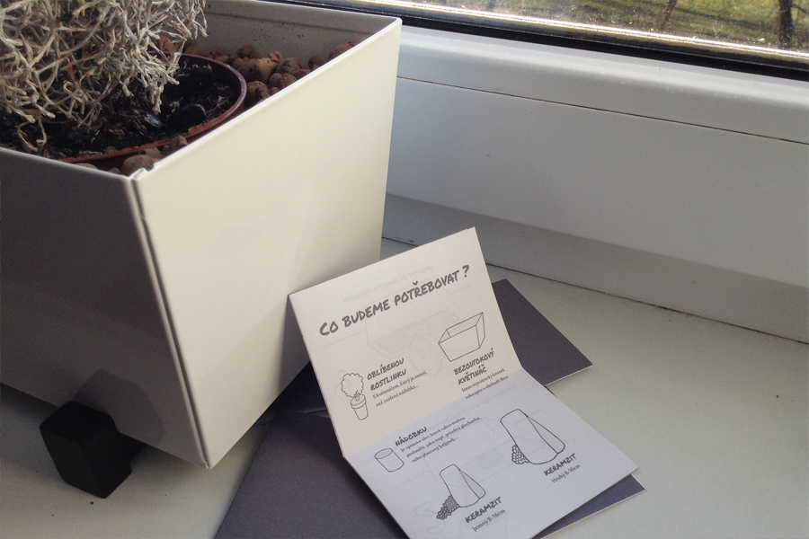 Jako návod jsem vytvořil postup pro efektivní využití bezodtokového květináče. Tvořil jsem zapomocí ručních kreseb, které jsem následně naskenoval do počítače a upravil. Výsledný formát je 9 x 6,5cm a je tisknut v odstínech šedi.
