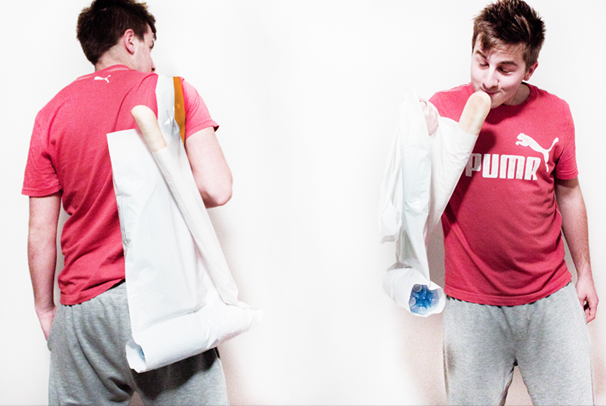 Moju inovatívnosť a atraktivitu tašky vidím v pridaní ramenných popruhov na zaistenie jednoduchšieho prenosu produktov. Ďalším prínosom je vytvorenie oddeleného priestoru na umiestnenie fľaše nápoja, bagety...(z bočnej alebo spodnej strany).