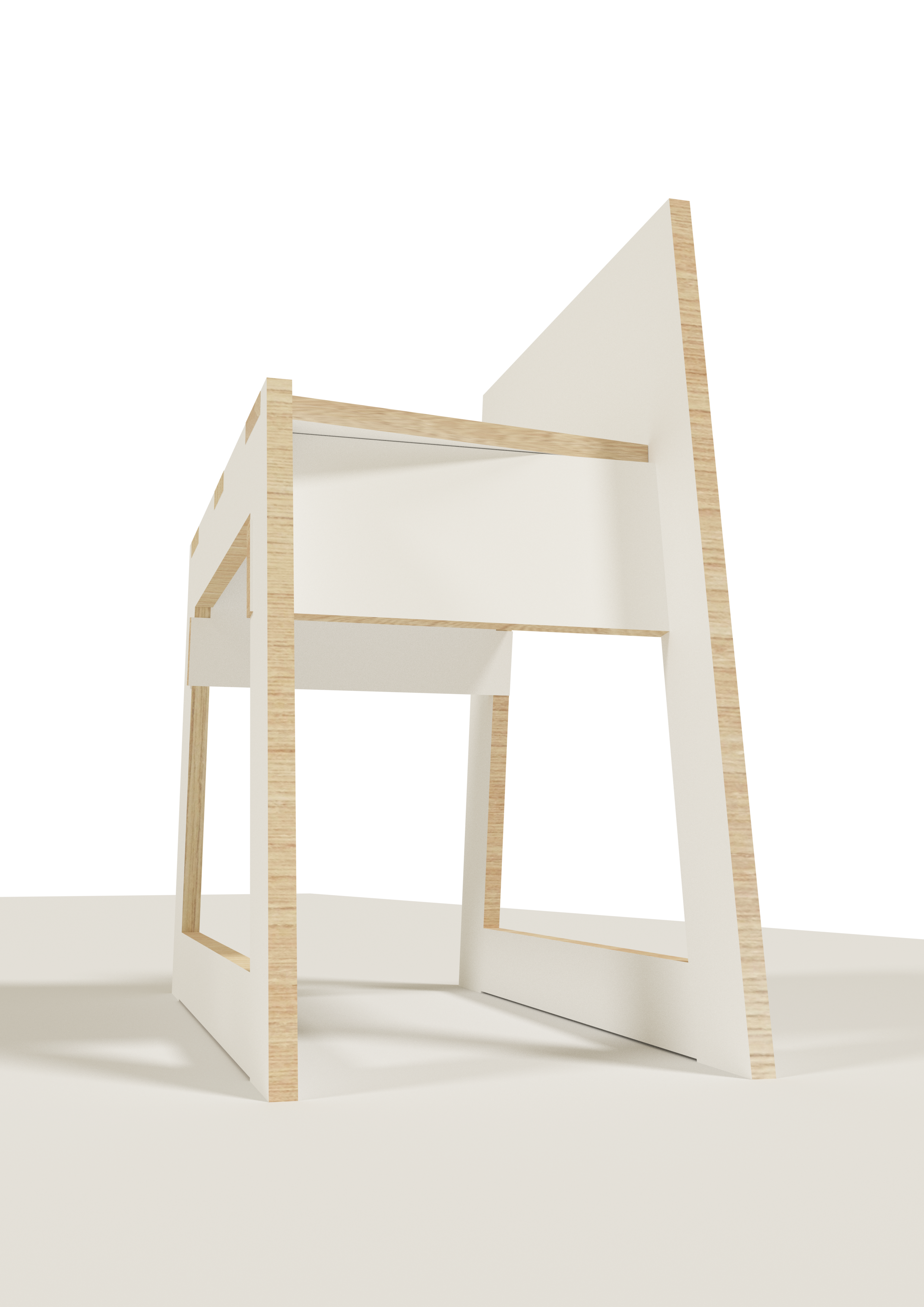 Při tvorbě této práce jsem pracovala s důrazem na rozklad plochy. Řešením je kombinace bílé barvy s přírodní texturou dřeva na okrajích pro zobrazení dynamičnosti a estetiky židle.