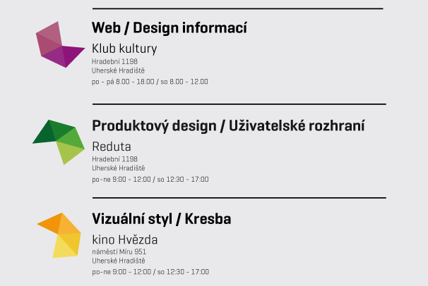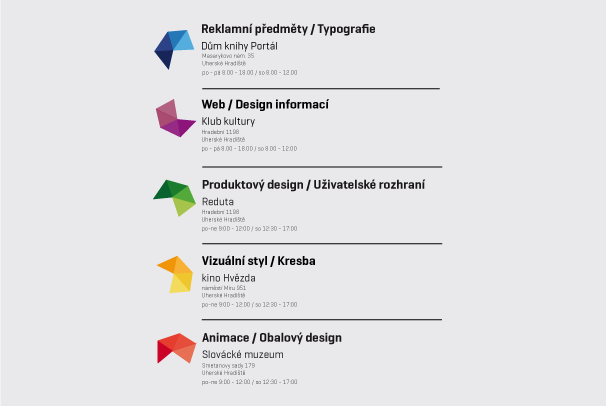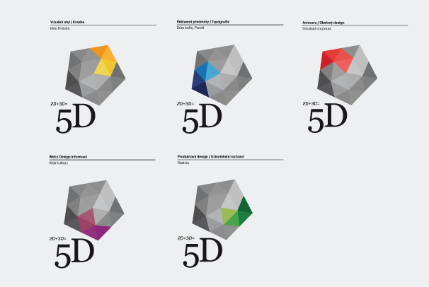 Vizuální styl vychází z pětiúhelníku, který se rozštěpuje na 5 segmentů / 5 výstav